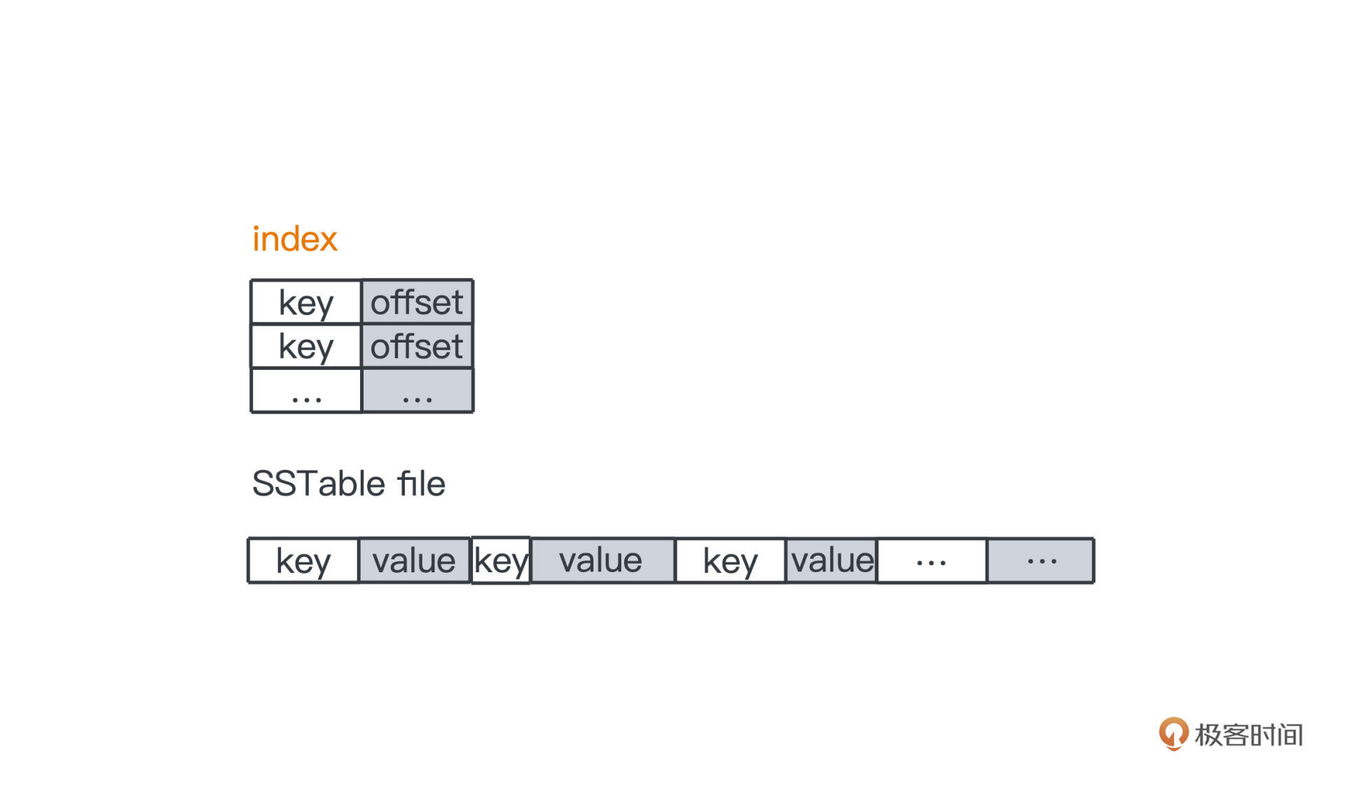 原始的SSTable,key和value可以是任意大小的,所以直接在磁盘上查询不是特别靠谱,但是SSTable本身的有序性,让我们可以采用类似Kafka的线性索引来加速查询过程,所以SSTable一般也会带上一个索引文件,值存储的是key所对应的offset,加载到内存后,我们利用二分搜索可以很快查找出要访问的key的值。