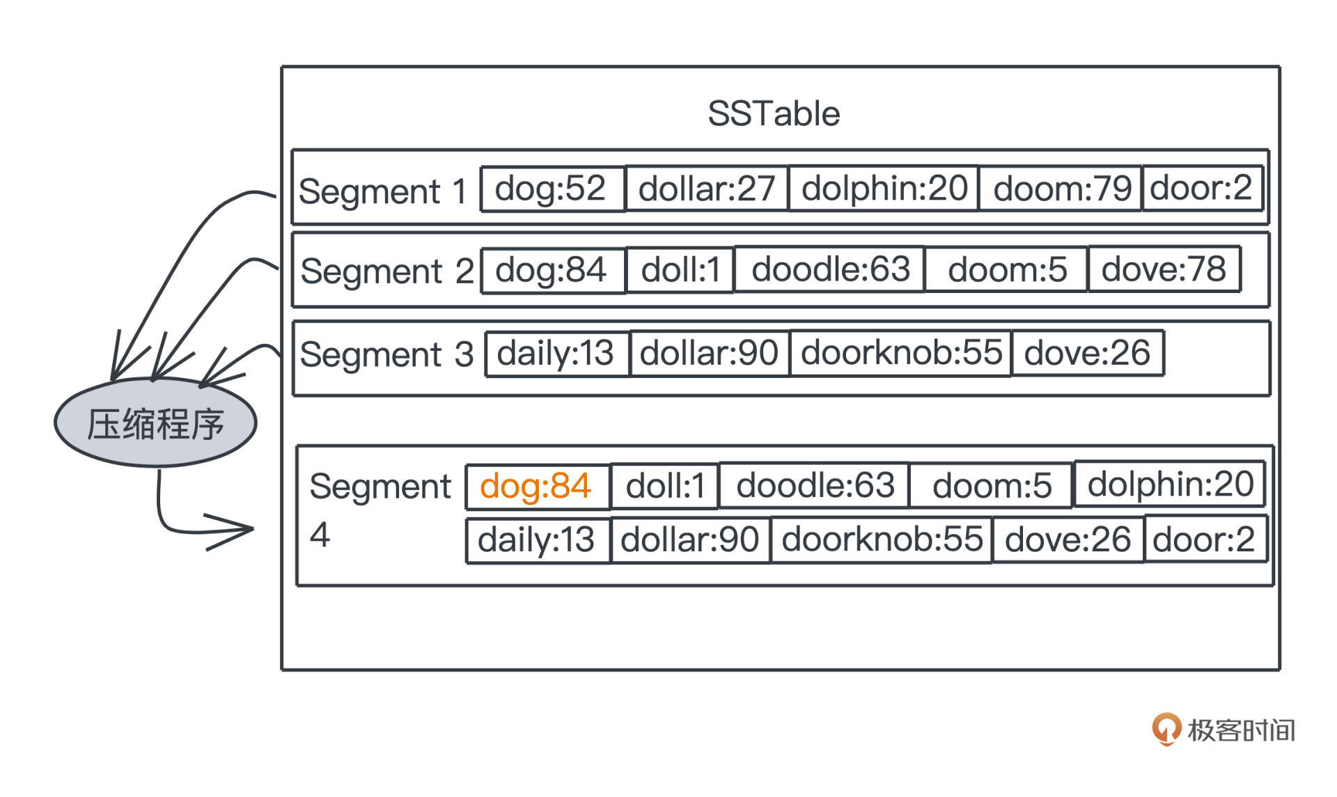 在图的例子中可以看出来,我们合并segment1、2、3之后,在得到的segment4里,dog的记录就只剩更新的segment2中的记录84了。这样我们的整个存储空间就不会无尽地膨胀,最高的一层,最多也就是占用历史以来所有出现过的key和对应的记录值这样数量级的空间,而存储这些是数据库本应做到的。