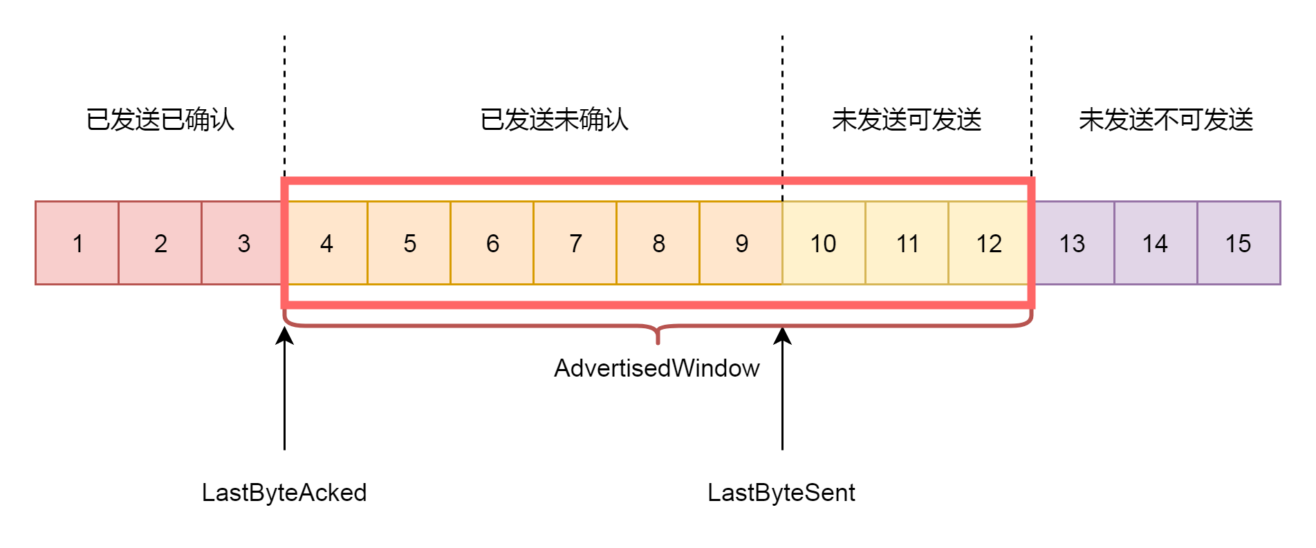 第一部分:发送了并且已经确认的。这部分是已经发送完毕的网络包,这部分没有用了,可以回收。 第二部分:发送了但尚未确认的。这部分,发送方要等待,万一发送不成功,还要重新发送,所以不能删除。 第三部分:没有发送,但是已经等待发送的。这部分是接收方空闲的能力,可以马上发送,接收方收得了。 第四部分:没有发送,并且暂时还不会发送的。这部分已经超过了接收方的接收能力,再发送接收方就收不了了。