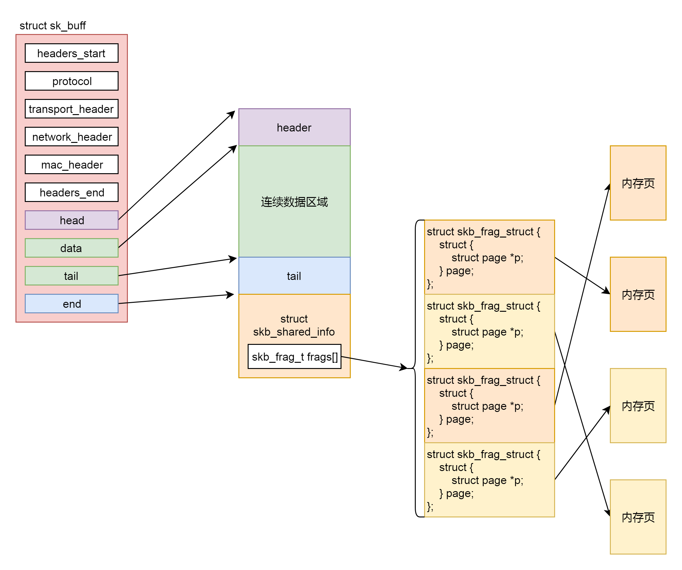 为了减少内存拷贝的代价,有的网络设备支持分散聚合 (Scatter/Gather)I/O,顾名思义,就是IP层没必要通过内存拷贝进行聚合,让散的数据零散的放在原处,在设备层进行聚合。如果使用这种模式,网络包的数据就不会放在连续的数据区域,而是放在struct skb_shared_info结构里面指向的离散数据,skb_shared_info的成员变量skb_frag_t frags[MAX_SKB_FRAGS],会指向一个数组的页面,就不能保证连续了。