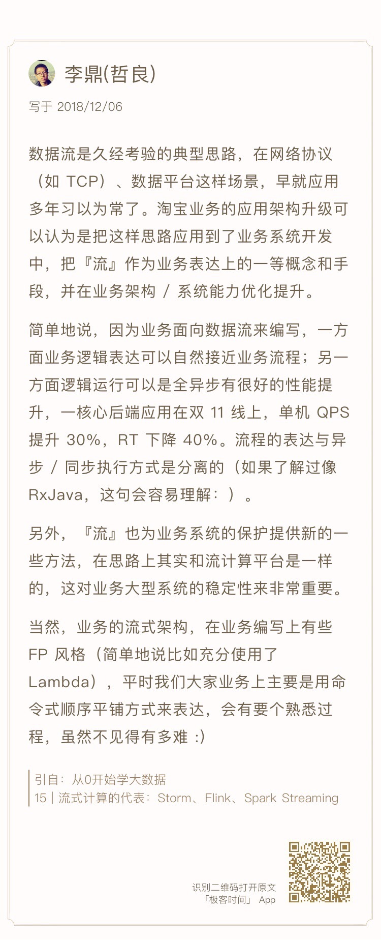 在专栏第15期,我邀请了淘宝的高级技术专家李鼎来聊聊流式业务架构重构的心得体会,我把他的留言也贴在下面,感兴趣的同学可以返回第15期,也和我们聊聊你对这种架构的思考与理解。