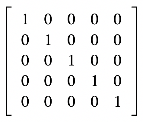 除了转置矩阵,另一个重要的概念是逆矩阵。为了理解逆矩阵或矩阵逆(Matrix Inversion),我们首先要理解单位矩阵(Identity Matrix)。单位矩阵中,所有沿主对角线的元素都是1,而其他位置的所有元素都是0。通常我们只考虑单位矩阵为方阵的情况,也就是行数和列数相等,我们把它记作$I_{n}$,$n$表示维数。我这里给出一个$I_{5}$的示例。