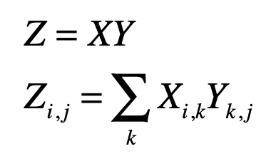 其中,矩阵$Z$为矩阵$X$和$Y$的乘积,$X$是形状为i x k的矩阵,而$Y$是形状为k × j的矩阵。$X$的列数k必须和$Y$的行数k相等,两者才可以进行这样的乘法。