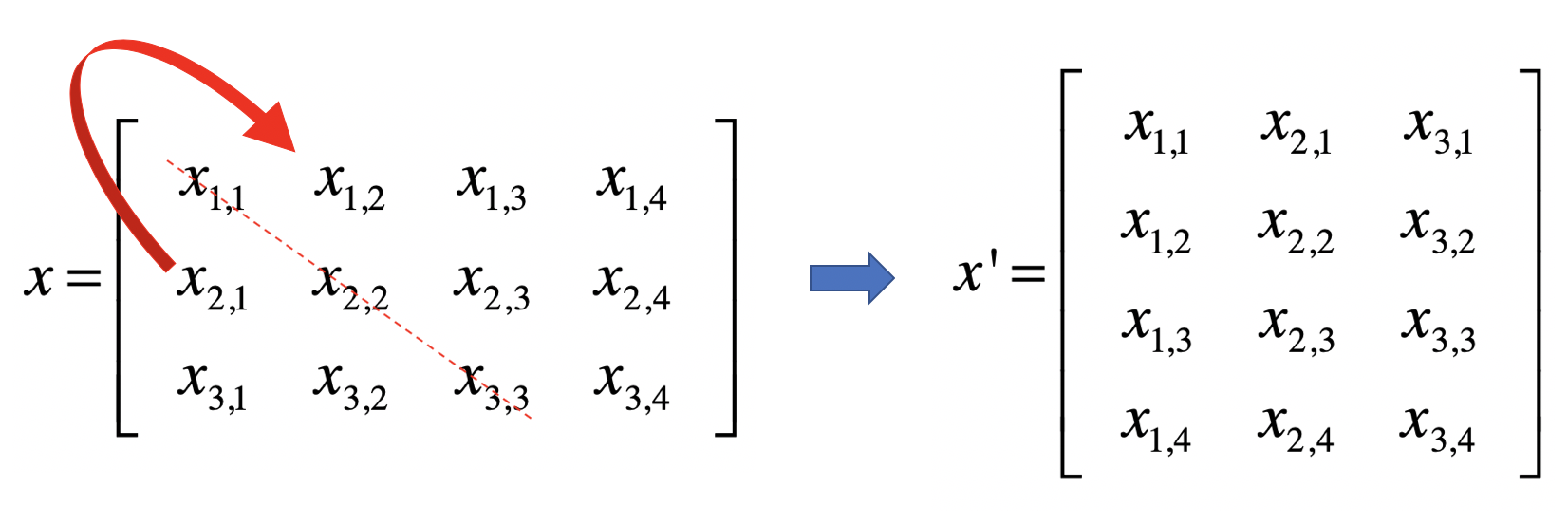 转置(Transposition)是指矩阵内的元素行索引和纵索引互换,例如$X_{ij}$就变为$X_{ji}$,相应的,矩阵的形状由转置前的n × m变为转置后的m × n。从几何的角度来说,矩阵的转置就是原矩阵以对角线为轴进行翻转后的结果。下面这张图展示了矩阵$X$转置之后的矩阵$X’$: