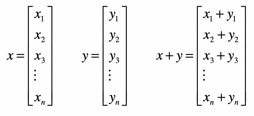 两个向量之间的加法,首先它们需要维度相同,然后是对应的元素相加。