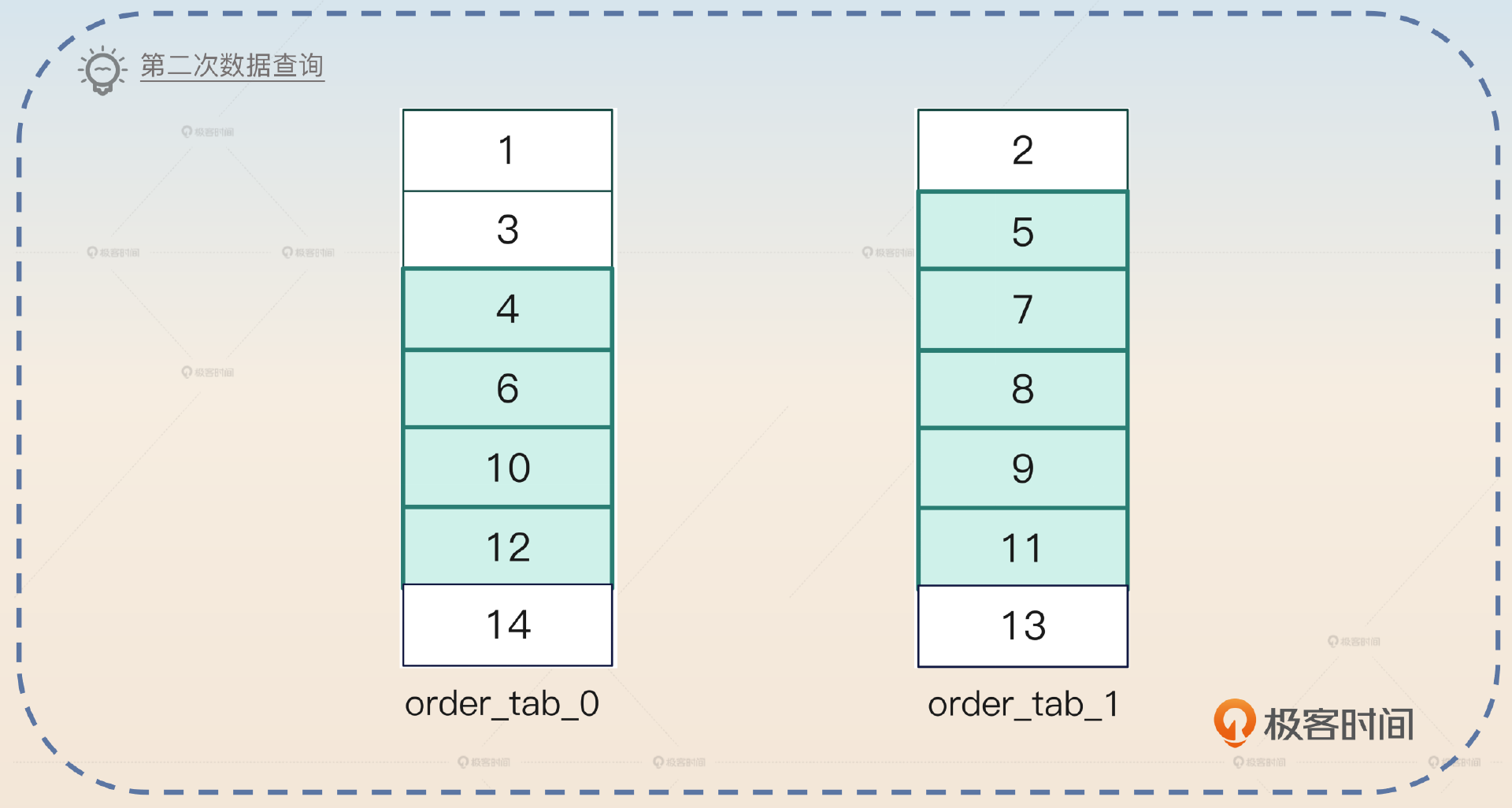 order_tab_0 拿到了 4、6、10、12,而 order_tab_1 拿到了 7、8、9、11。