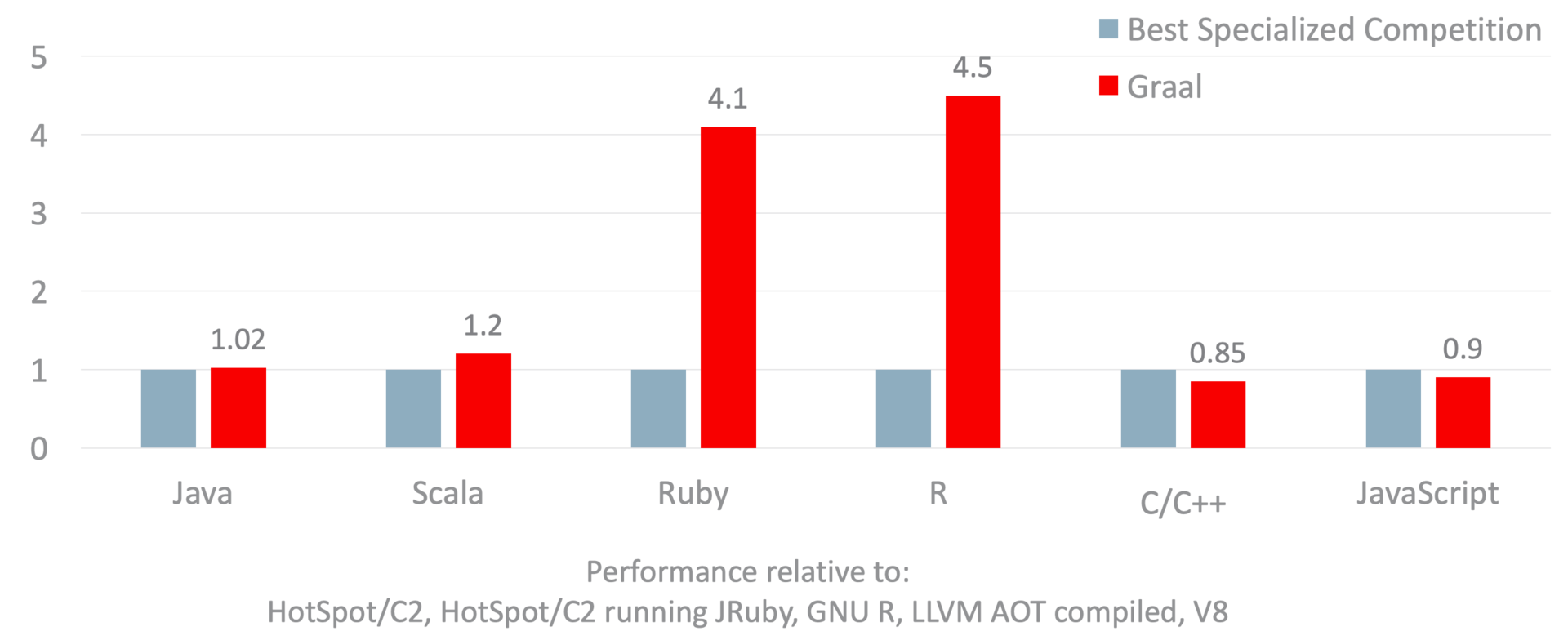 - 对于Ruby,我比较的是运行在HotSpot虚拟机之上的JRuby和Truffle Ruby。