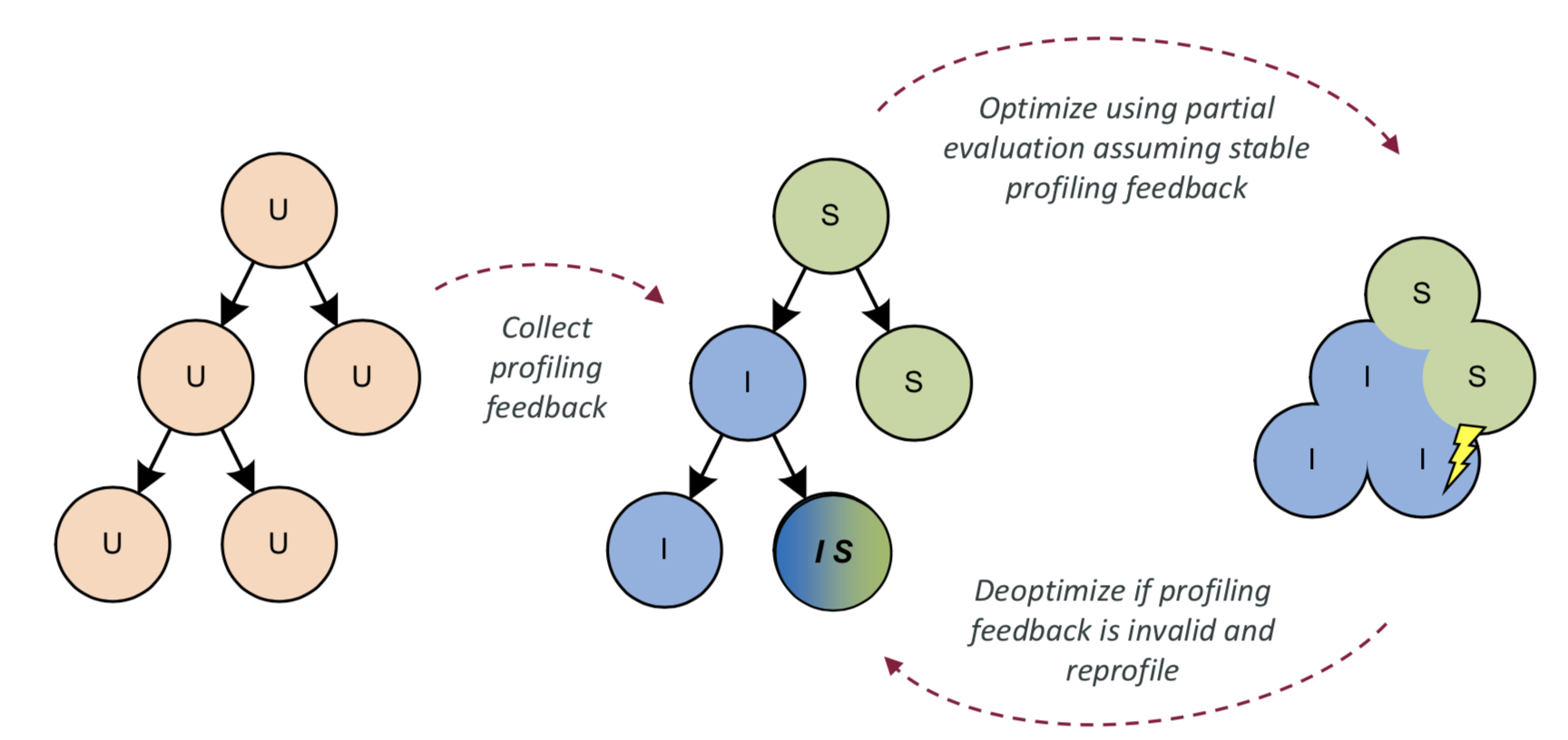 在即时编译过后,如果运行过程中发现AST节点的实际类型和所假设的类型不同,Truffle会主动调用Graal编译器提供的去优化API,返回至解释执行AST节点的状态,并且重新收集AST节点的类型信息。之后,Truffle会再次利用Graal编译器进行新一轮的即时编译。