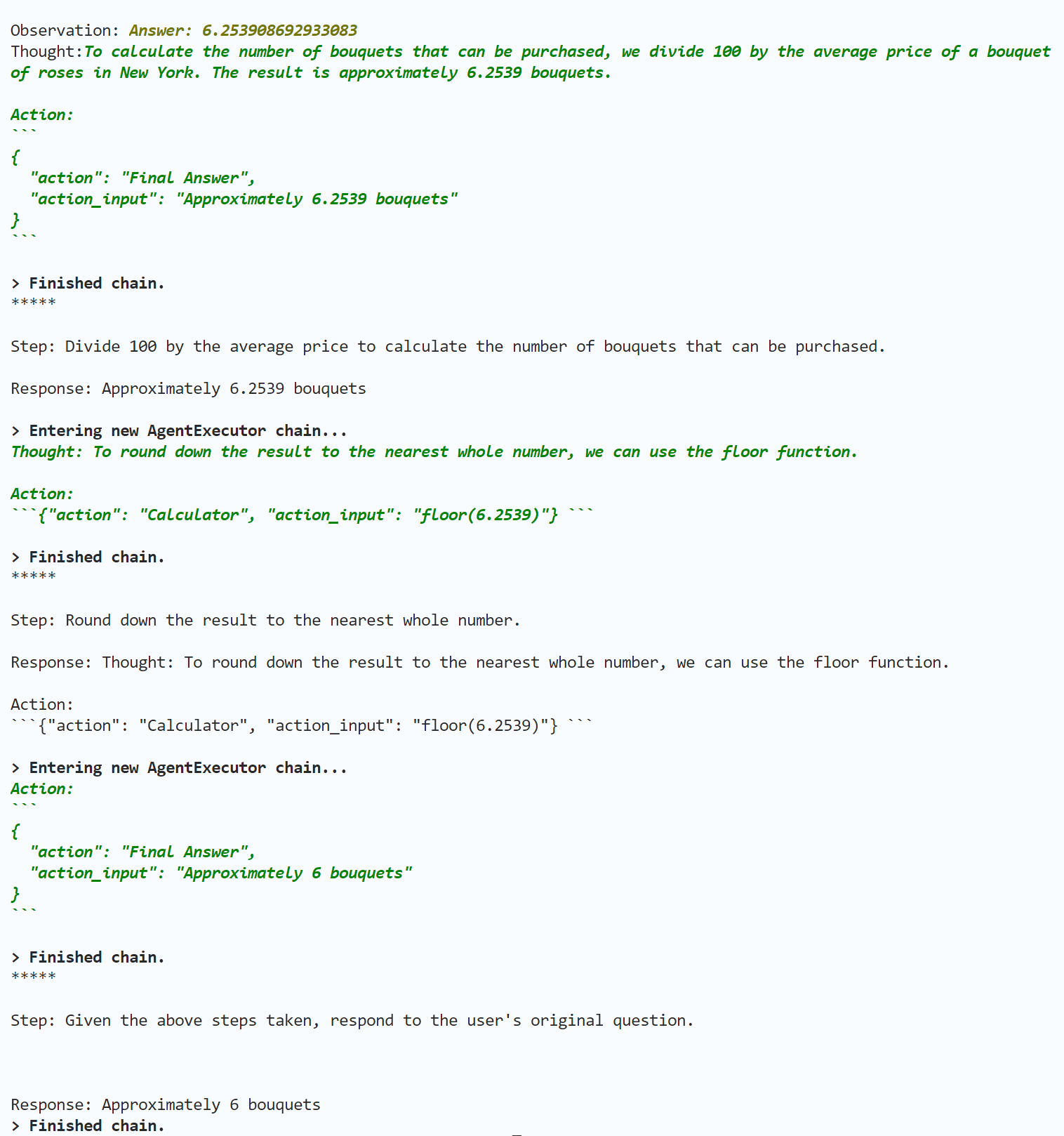 在上面输出中,PlanAndExecute 链的调用流程以及代理的思考过程,我就留给你来做分析了,相信你可以把握住Plan and execute代理解决问题的基本脉络。
