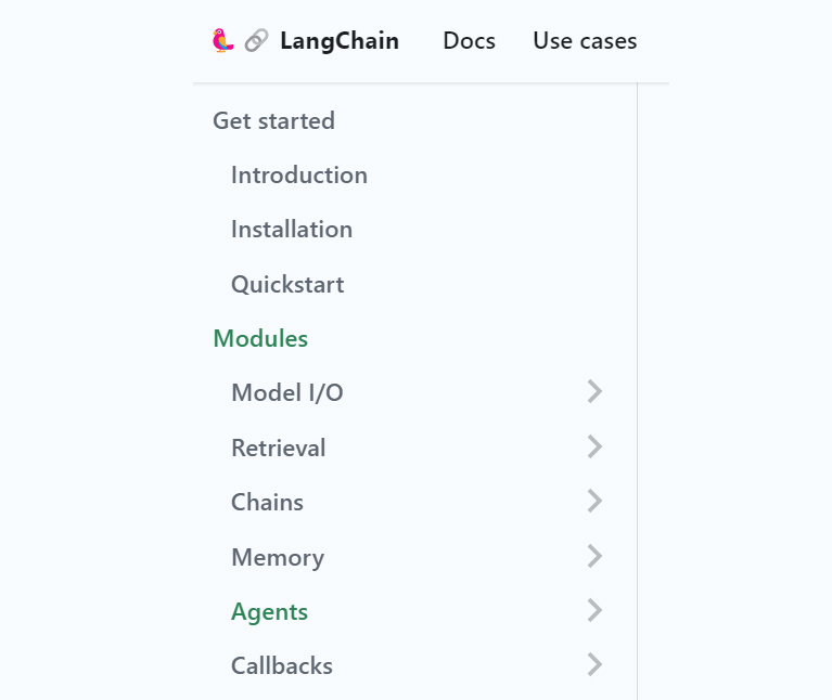 Observation: [{“innerText”: “Introduction”}, {“innerText”: “Get started”}, {“innerText”: “Modules”}, {“innerText”: “Model I/O”}, {“innerText”: “Data connection”}, {“innerText”: “Chains”}, {“innerText”: “Agents”}, {“innerText”: “Memory”}, {“innerText”: “Callbacks”}, {“innerText”: “Examples, ecosystem, and resources”}, {“innerText”: “Use cases”}, {“innerText”: “Guides”}, {“innerText”: “Ecosystem”}, {“innerText”: “Additional resources”}, {“innerText”: “Support”}, {“innerText”: “API reference”}]