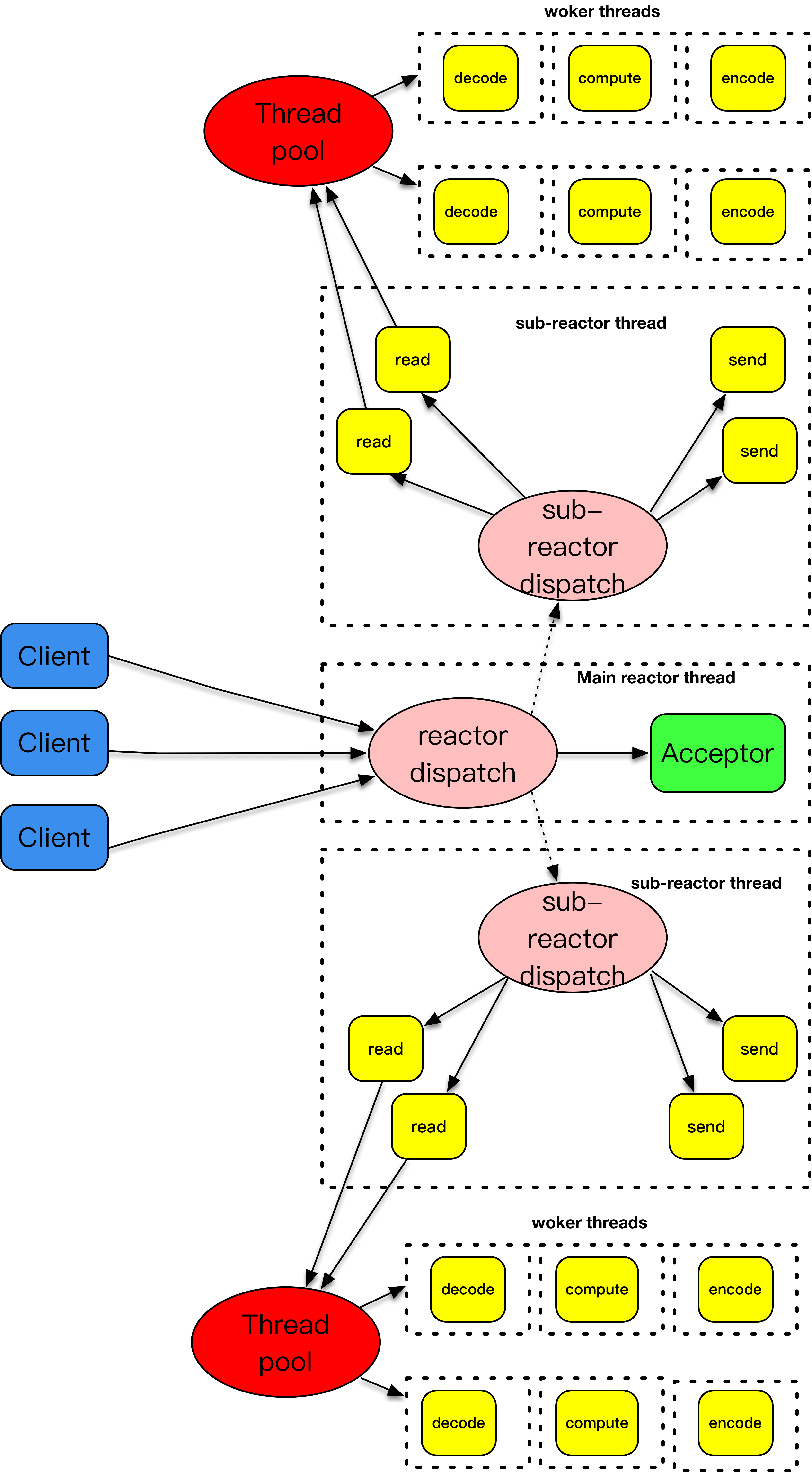这张图解释了主-从反应堆下加上worker线程池的处理模式。
