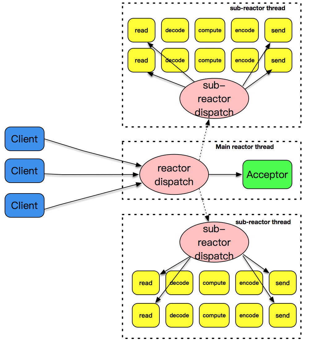 主-从这个模式的核心思想是,主反应堆线程只负责分发Acceptor连接建立,已连接套接字上的I/O事件交给sub-reactor负责分发。其中sub-reactor的数量,可以根据CPU的核数来灵活设置。
