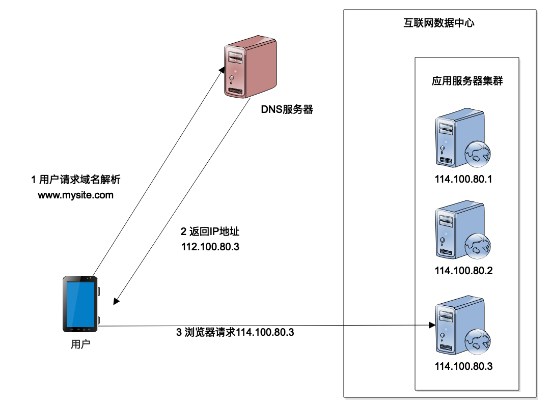 另一种实现负载均衡的技术方案是DNS负载均衡。我们知道浏览器或者App应用访问数据中心的时候,通常是用域名进行访问,HTTP协议则必须知道IP地址才能建立通信连接,那么域名是如何转换成IP地址的呢?就是通过DNS服务器来完成。当用户从浏览器发起HTTP请求的时候,首先要到DNS域名服务器进行域名解析,解析得到IP地址以后,用户才能够根据IP地址建立HTTP连接,访问真正的数据中心的应用服务器,这时候就可以在DNS域名解析的时候进行负载均衡,也就是说,不同的用户进行域名解析的时候,返回不同的IP地址,从而实现负载均衡。