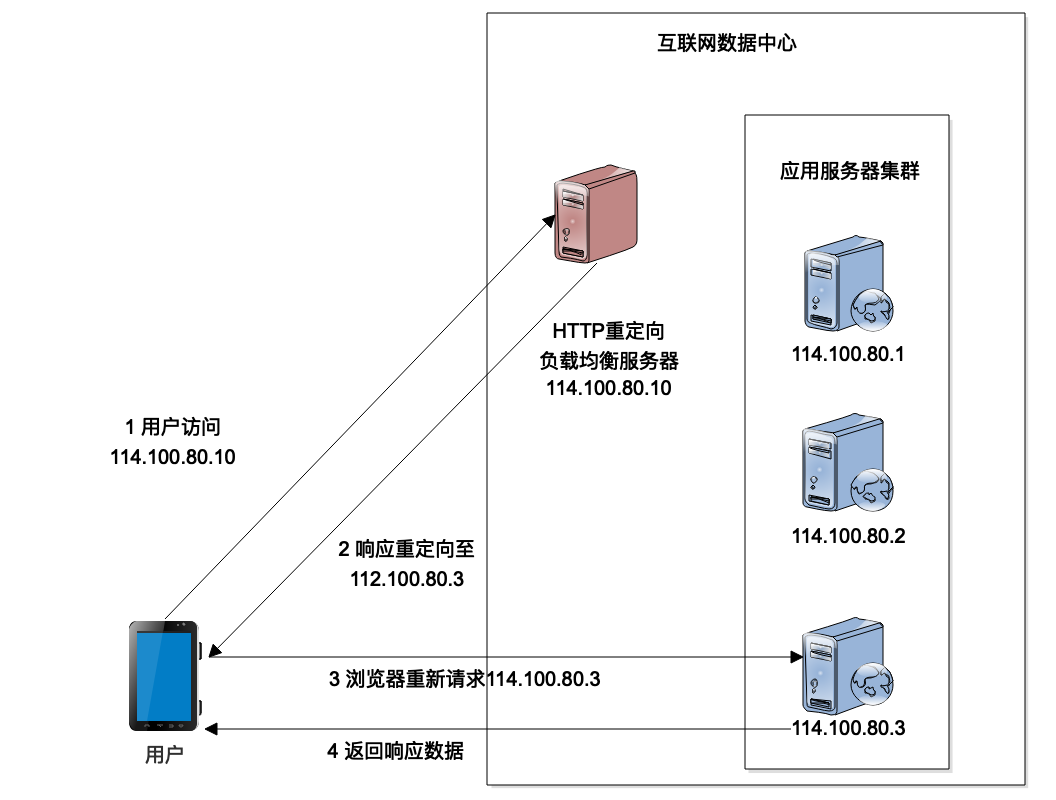 这种负载均衡实现方法比较简单,如果是用Java开发的话,只需要在Servlet代码中调用响应重定向方法就可以了。在简化的情况下,只需要不到十行代码就可以实现一个HTTP重定向负载均衡服务器。