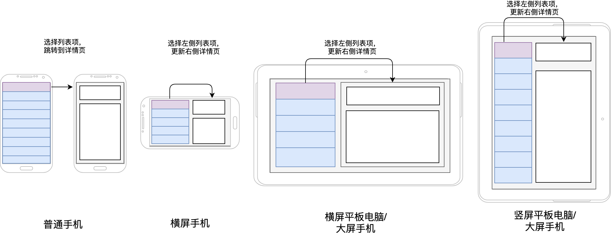 如下图所示,分别展示了普通手机、横屏手机与平板电脑,如何使用多窗格布局来改造新闻列表和新闻详情交互: