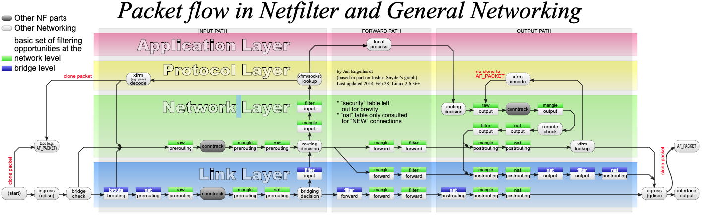 其中,iptables 就是最常用的一种配置工具。要掌握 iptables 的原理和使用方法,最核心的就是弄清楚,网络数据包通过 Netfilter 时的工作流向,下面这张图就展示了这一过程。