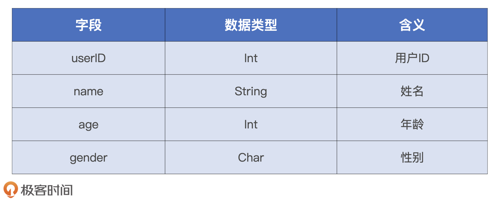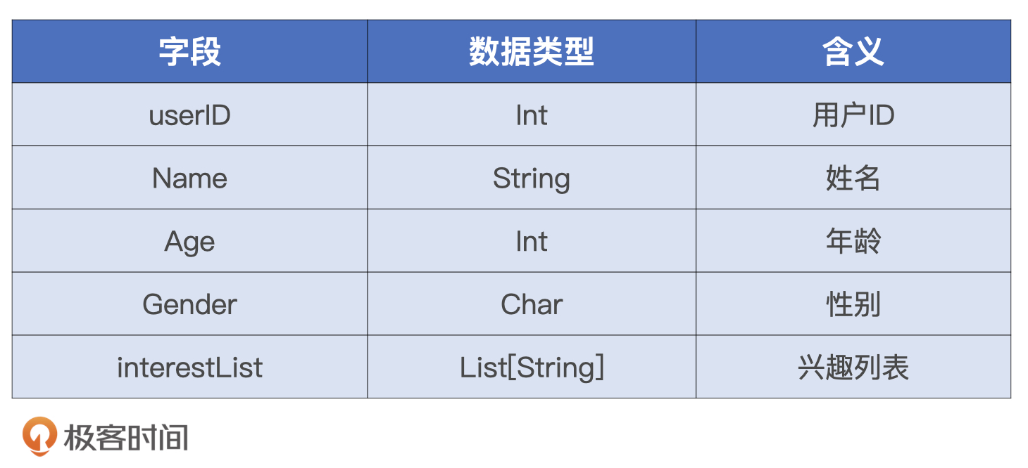 不过,成也萧何败也萧何,字节数组自身的局限性也很难突破。比如说,如果用户表1新增了兴趣列表字段,类型为List[String],如用户表2所示。这个时候,如果我们仍然采用字节数据的方式来存储每一条用户记录,不仅越来越多的指针和偏移地址会让字段的访问效率大打折扣,而且,指针越多,内存泄漏的风险越大,数据访问的稳定性就值得担忧了。