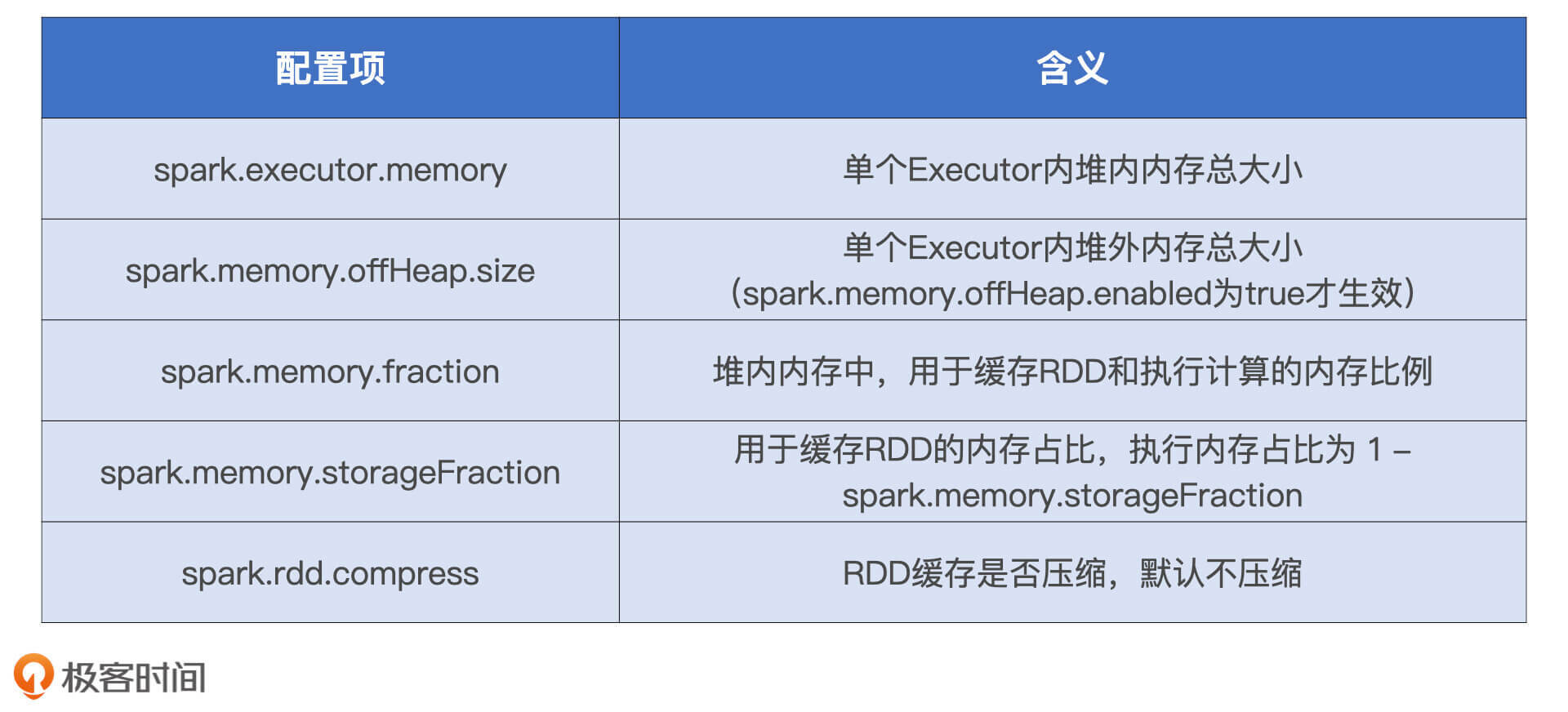 - 在平衡Execution memory与Storage memory的时候,如果RDD缓存是刚需,我们就把spark.memory.storageFraction调大,并且在应用中优先把缓存灌满,再把计算逻辑应用在缓存数据之上。除此之外,我们还可以同时调整spark.rdd.compress和spark.memory.storageFraction来缓和Full GC的冲击