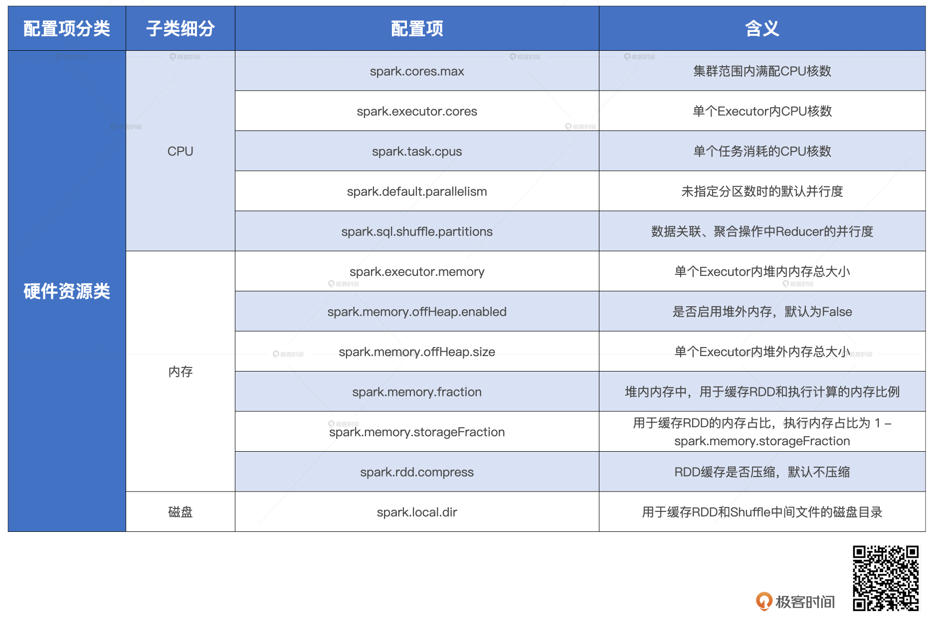 事实上,能够显著影响执行性能的配置项屈指可数,更何况在Spark分布式计算环境中,计算负载主要由Executors承担,Driver主要负责分布式调度,调优空间有限,因此对Driver端的配置项我们不作考虑,我们要汇总的配置项都围绕Executors展开。那么,结合过往的实践经验,以及对官网全量配置项的梳理,我把它们划分为3类,分别是硬件资源类、Shuffle类和Spark SQL大类。