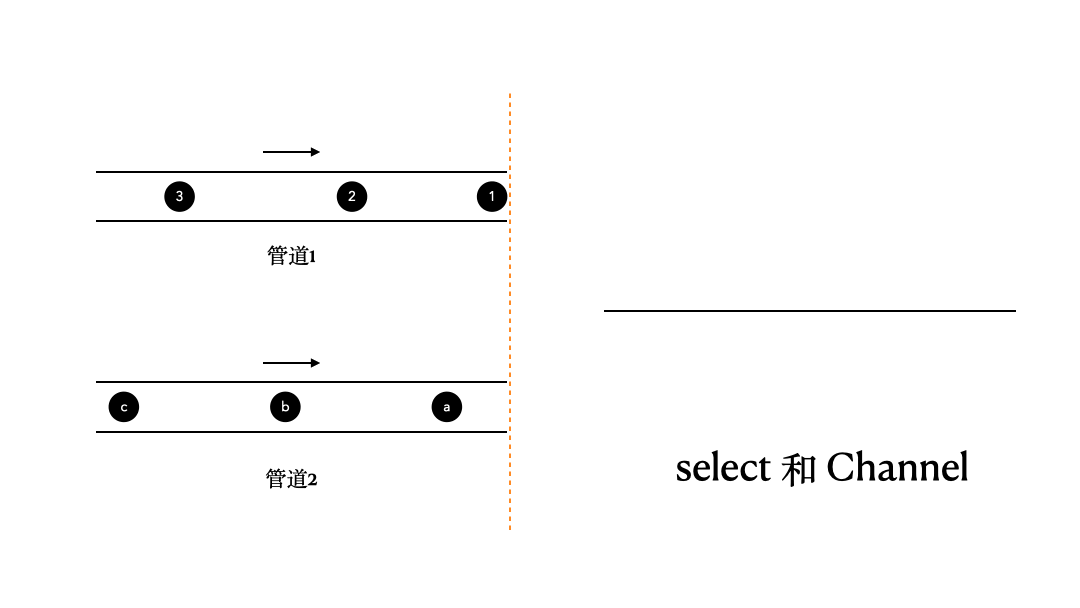 那么,这里我们来看看select和Channel的搭配使用。这里,我们有两个管道,channel1、channel2,它们里面的内容分别是1、2、3;a、b、c,我们通过select,将它们当中的数据收集出来并打印。