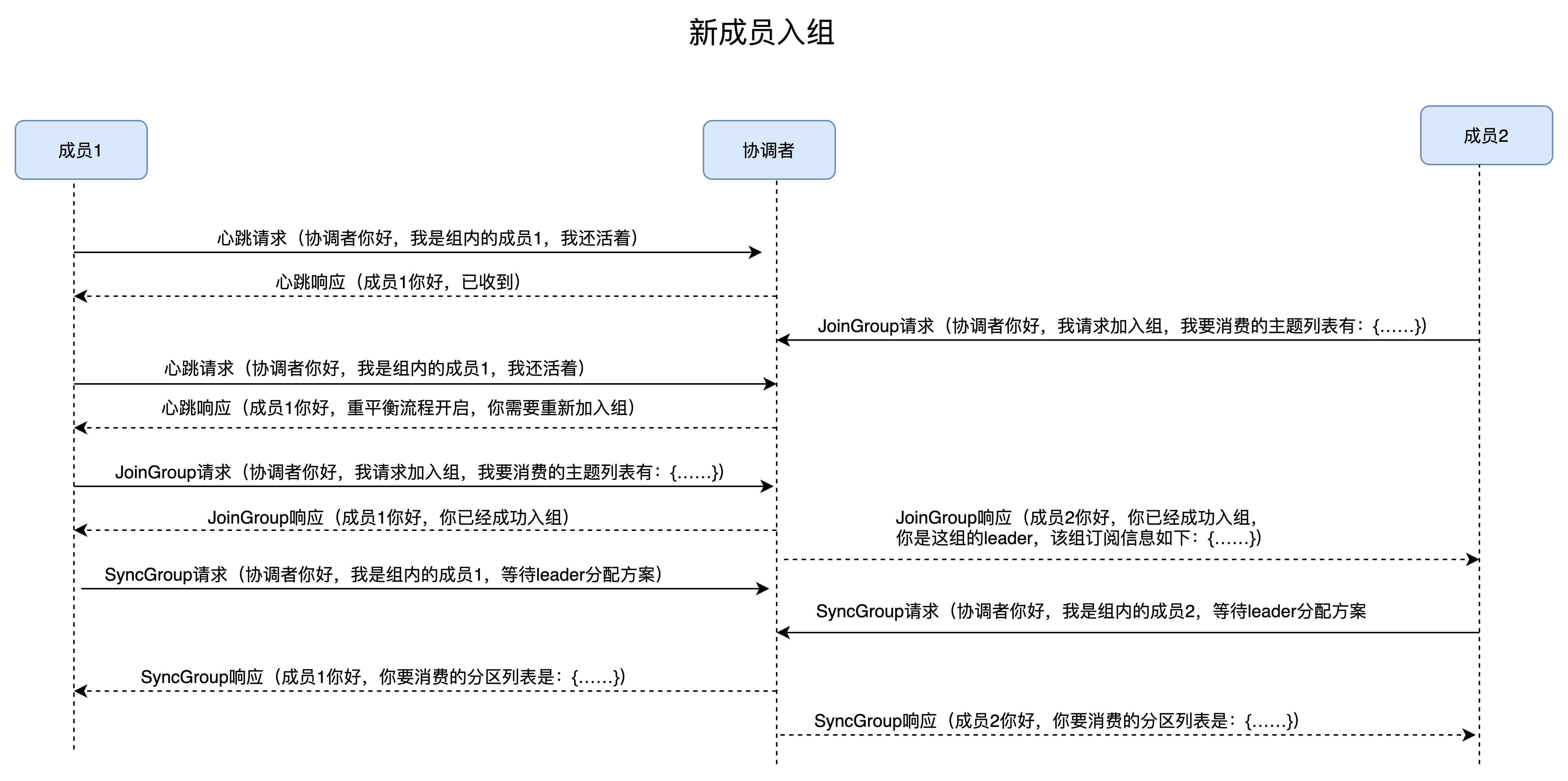 新成员入组是指组处于Stable状态后,有新成员加入。如果是全新启动一个消费者组,Kafka是有一些自己的小优化的,流程上会有些许的不同。我们这里讨论的是,组稳定了之后有新成员加入的情形。
