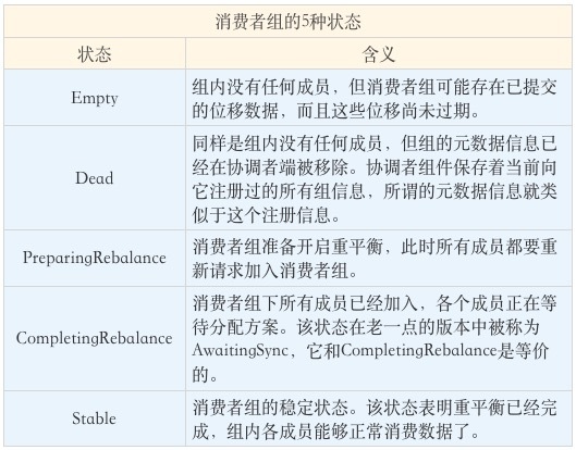 目前,Kafka为消费者组定义了5种状态,它们分别是:Empty、Dead、PreparingRebalance、CompletingRebalance和Stable。那么,这5种状态的含义是什么呢?我们一起来看看下面这张表格。