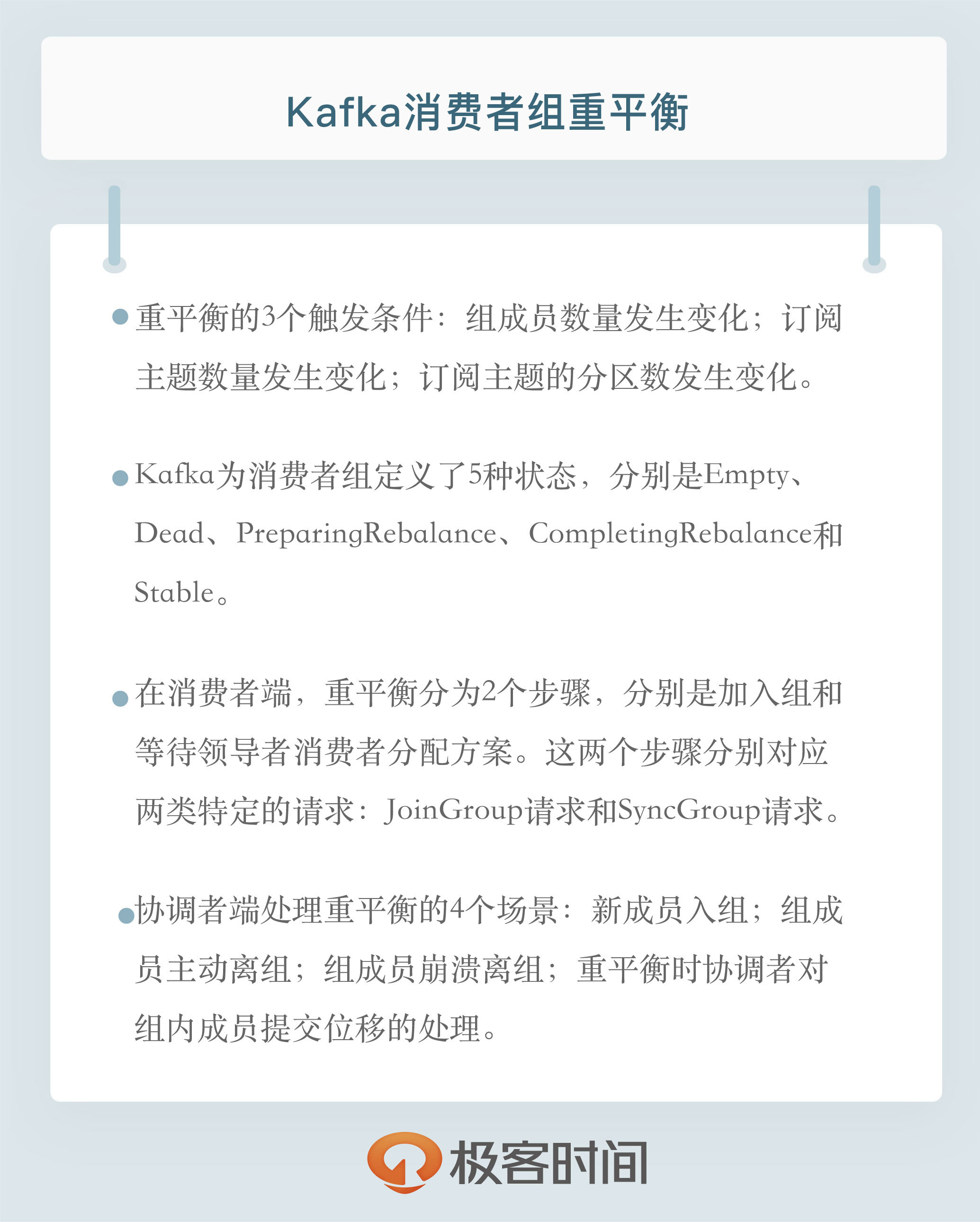 好了,消费者重平衡流程我已经全部讲完了。虽然全程我都是拿两个成员来举例子,但你可以很容易地扩展到多个成员的消费者组,毕竟它们的原理是相同的。我希望你能多看几遍今天的内容,彻底掌握Kafka的消费者重平衡流程。社区正在对目前的重平衡流程做较大程度的改动,如果你不了解这些基础的设计原理,后面想深入学习这部分内容的话,会十分困难。