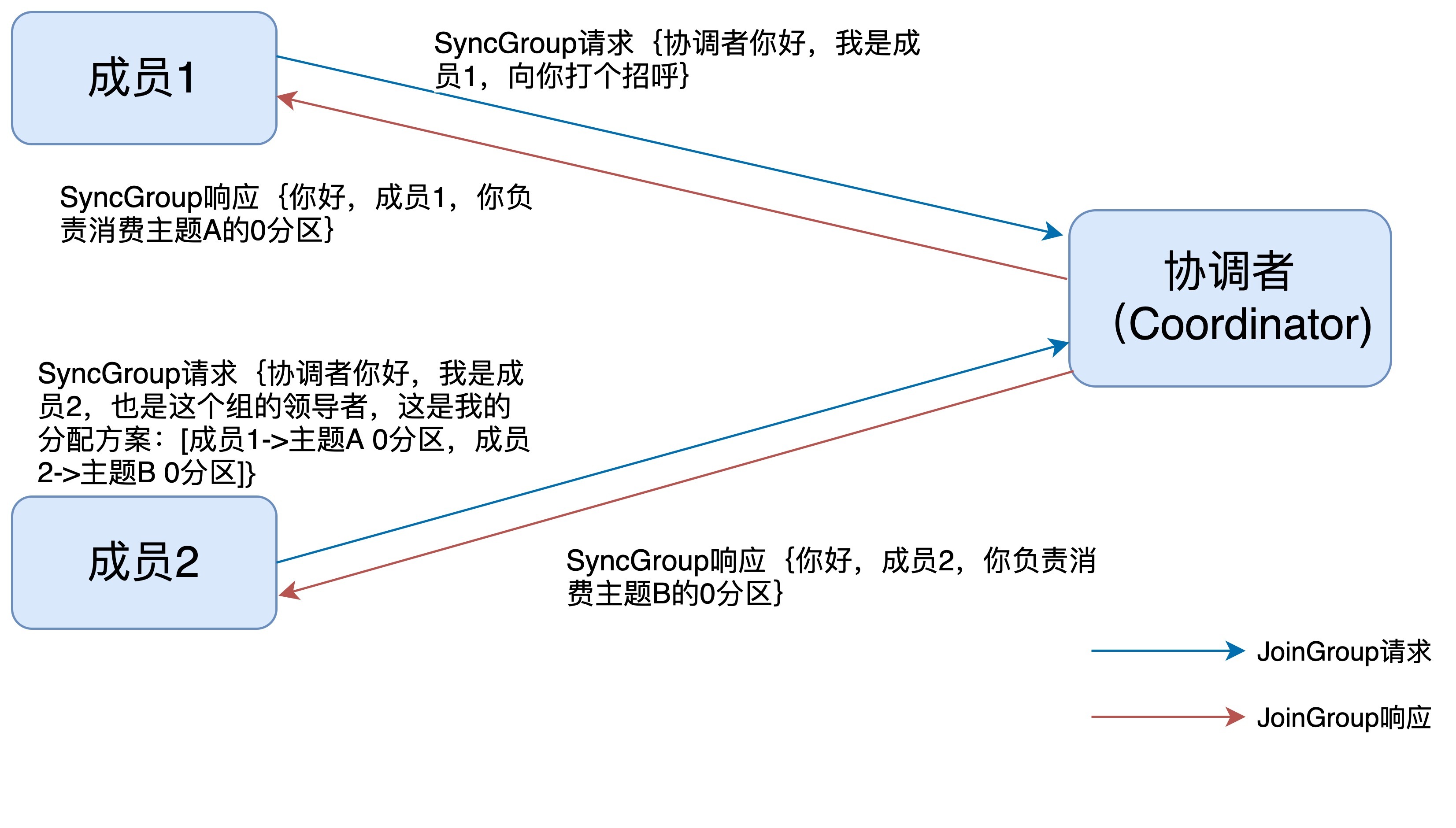在这一步中,领导者向协调者发送SyncGroup请求,将刚刚做出的分配方案发给协调者。值得注意的是,其他成员也会向协调者发送SyncGroup请求,只不过请求体中并没有实际的内容。这一步的主要目的是让协调者接收分配方案,然后统一以SyncGroup响应的方式分发给所有成员,这样组内所有成员就都知道自己该消费哪些分区了。