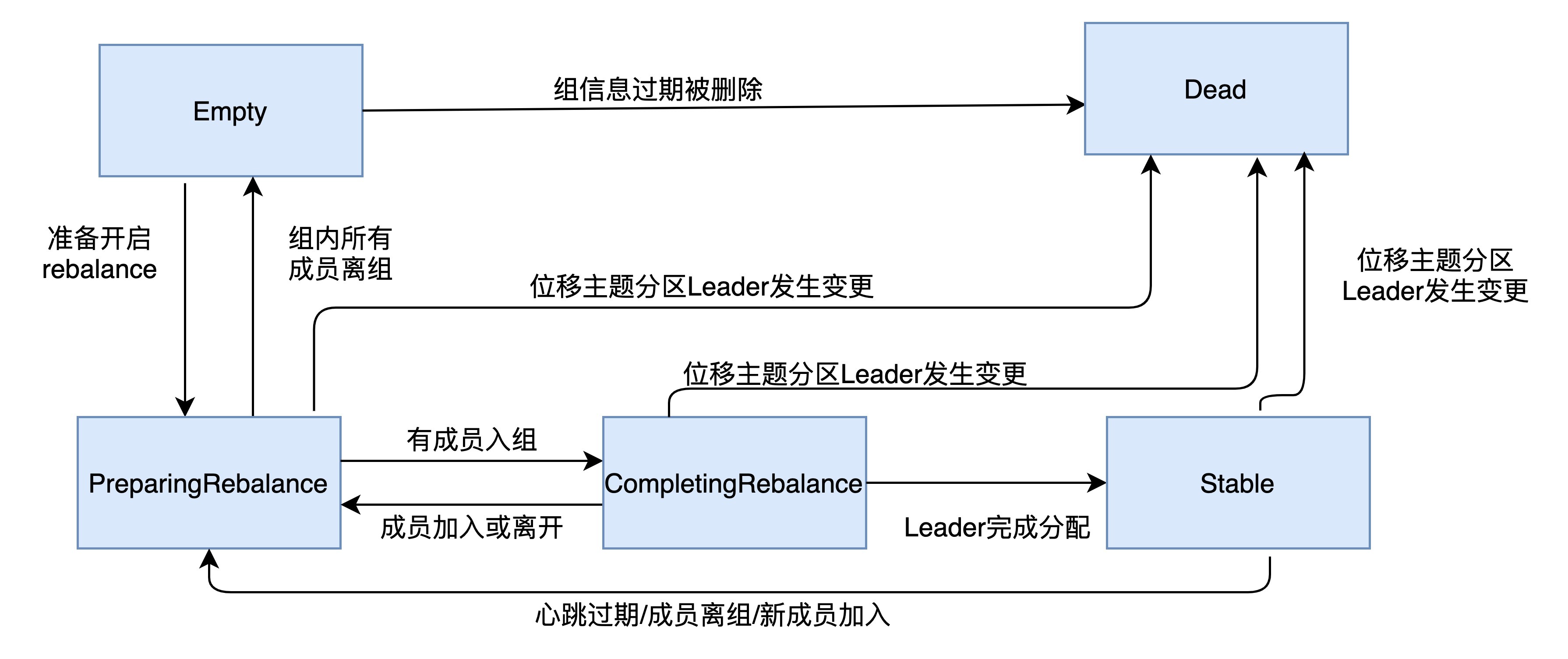 我来解释一下消费者组启动时的状态流转过程。一个消费者组最开始是Empty状态,当重平衡过程开启后,它会被置于PreparingRebalance状态等待成员加入,之后变更到CompletingRebalance状态等待分配方案,最后流转到Stable状态完成重平衡。