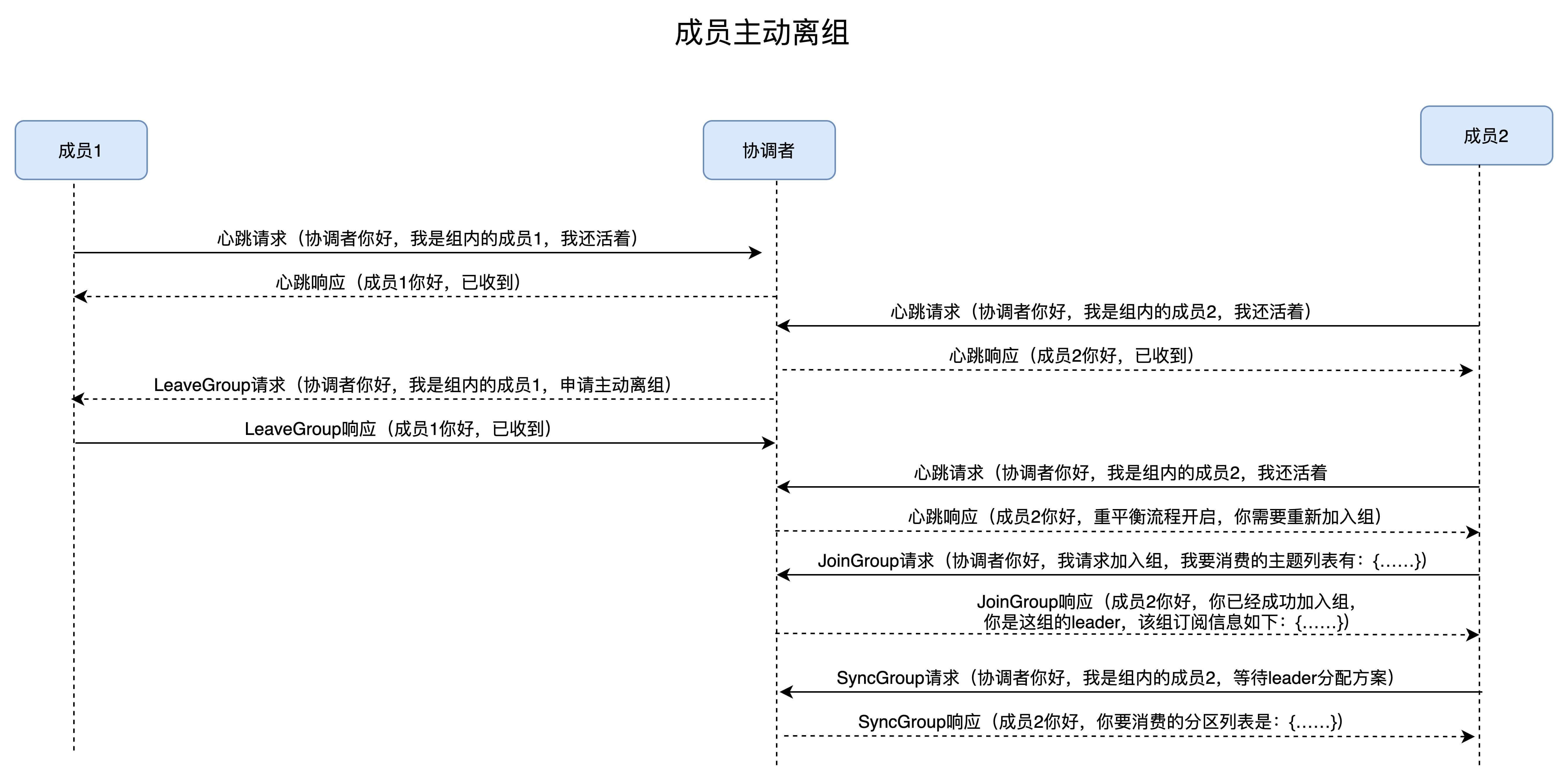 何谓主动离组?就是指消费者实例所在线程或进程调用close()方法主动通知协调者它要退出。这个场景就涉及到了第三类请求:LeaveGroup请求。协调者收到LeaveGroup请求后,依然会以心跳响应的方式通知其他成员,因此我就不再赘述了,还是直接用一张图来说明。