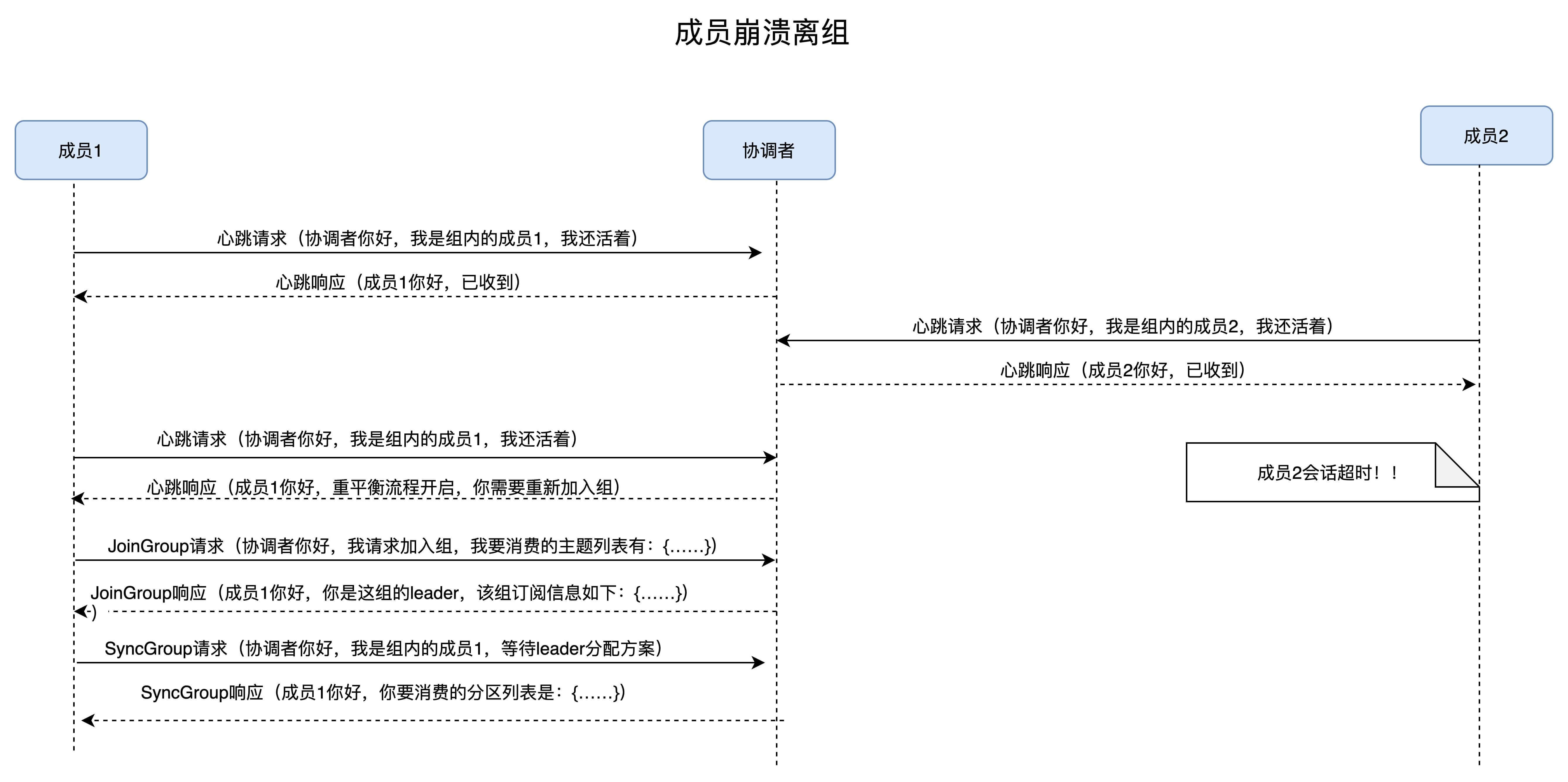 崩溃离组是指消费者实例出现严重故障,突然宕机导致的离组。它和主动离组是有区别的,因为后者是主动发起的离组,协调者能马上感知并处理。但崩溃离组是被动的,协调者通常需要等待一段时间才能感知到,这段时间一般是由消费者端参数session.timeout.ms控制的。也就是说,Kafka一般不会超过session.timeout.ms就能感知到这个崩溃。当然,后面处理崩溃离组的流程与之前是一样的,我们来看看下面这张图。