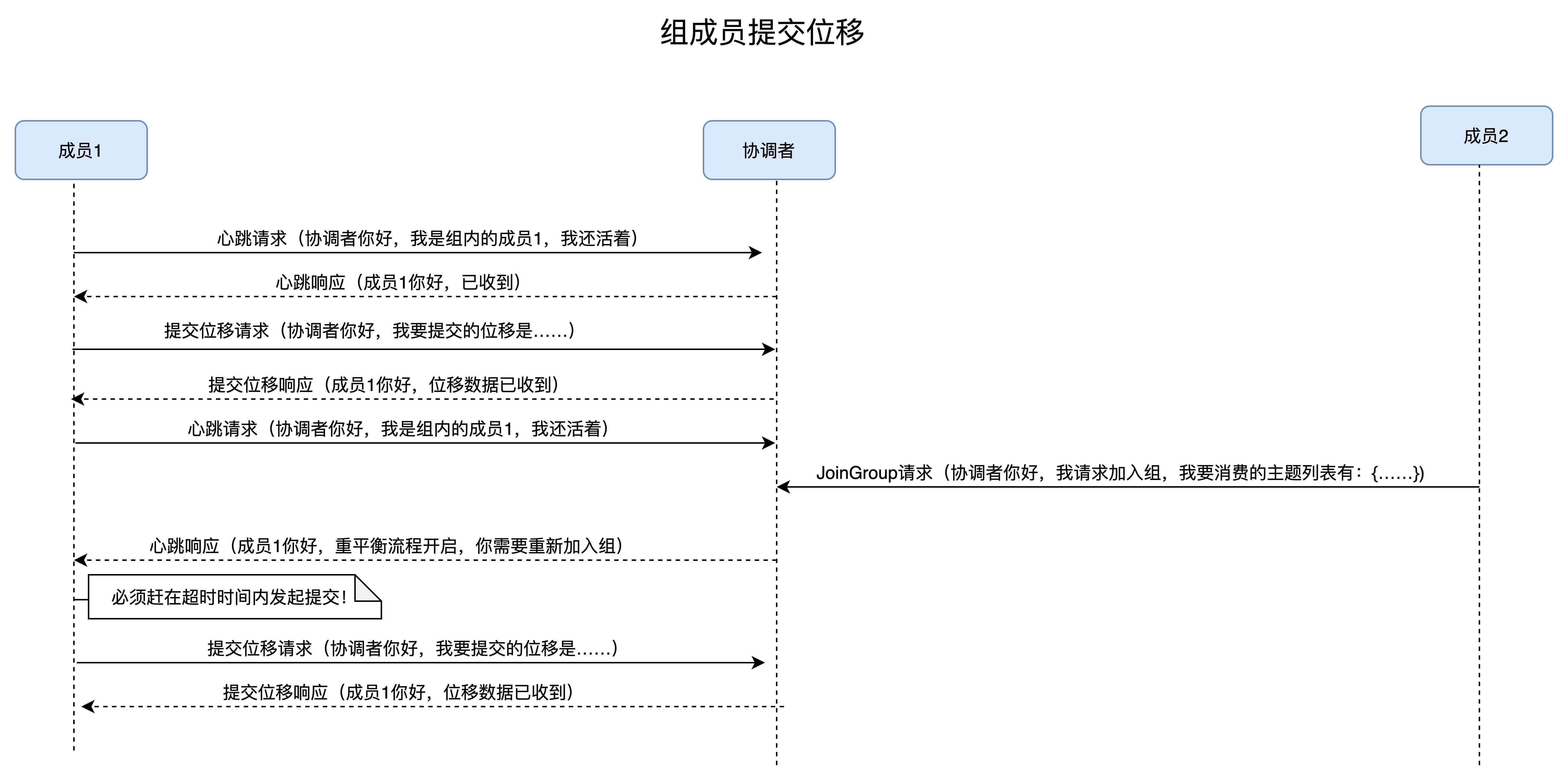 正常情况下,每个组内成员都会定期汇报位移给协调者。当重平衡开启时,协调者会给予成员一段缓冲时间,要求每个成员必须在这段时间内快速地上报自己的位移信息,然后再开启正常的JoinGroup/SyncGroup请求发送。还是老办法,我们使用一张图来说明。