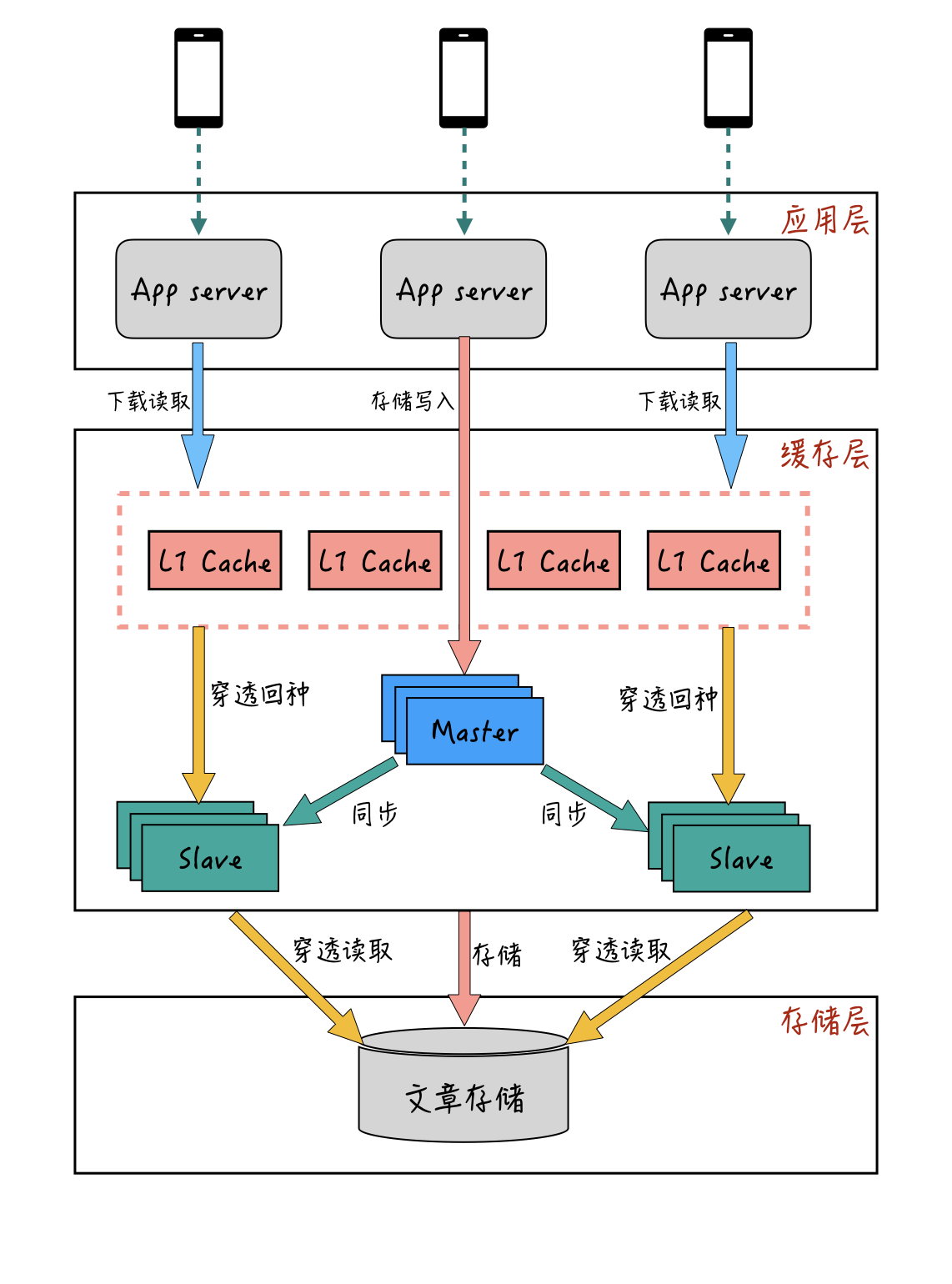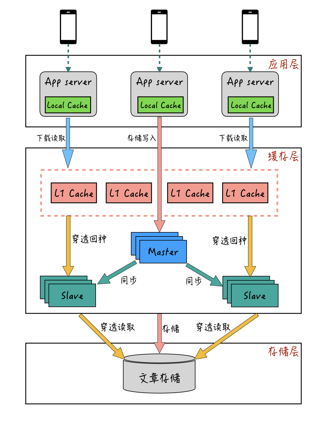 L1缓存作为最前端的缓存层,在用户请求的时候,会先从L1缓存进行查询。如果L1缓存中没有,再从主从缓存里查询,查询到的结果也会回种一份到L1缓存中。
