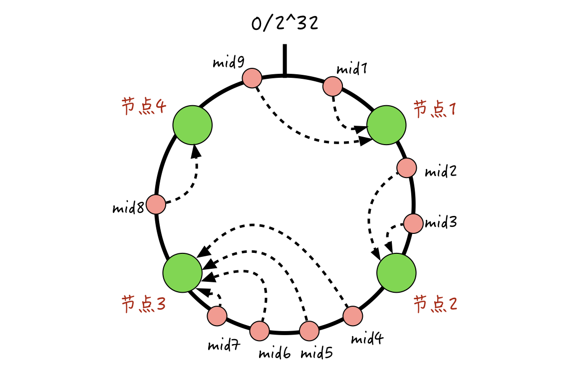 如上面这个例子,本来都落在节点3的4条消息mid4、mid5、mid6、mid7,在加入节点1的虚拟节点后,mid4和mid5落到了虚拟节点1-2上,这样mid4和mid5就被分配到物理节点1上了。可见,通过这种方式,能更好地打散数据的分布,解决节点间数据不平衡的问题。