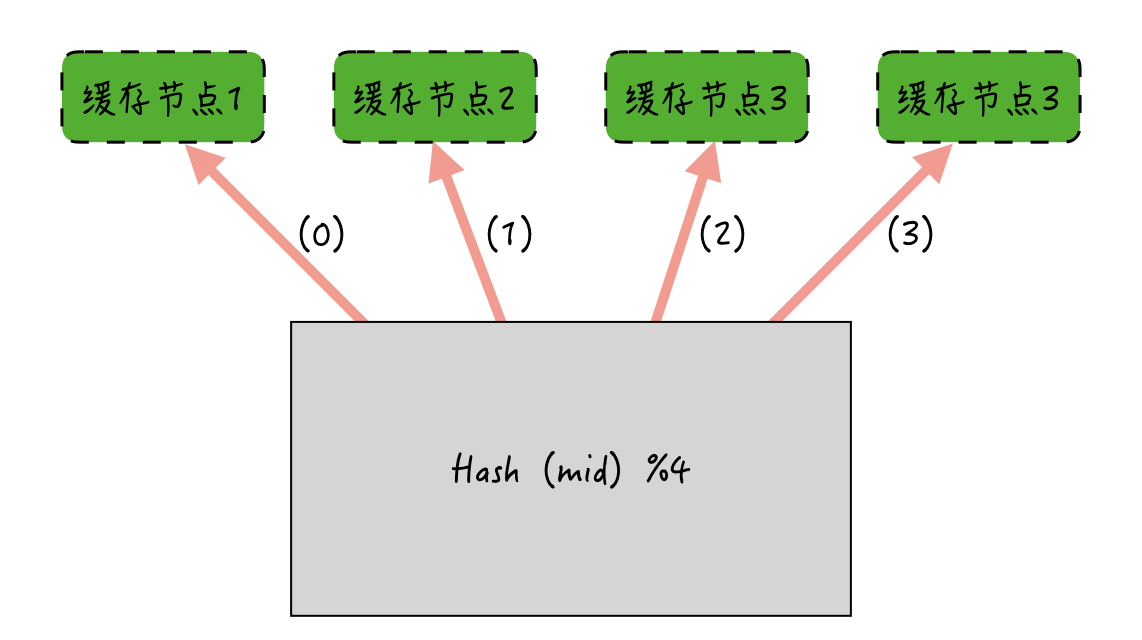 如下图所示:如果消息ID哈希后对缓存节点取模求余,余数是多少,就缓存到哪个节点上。