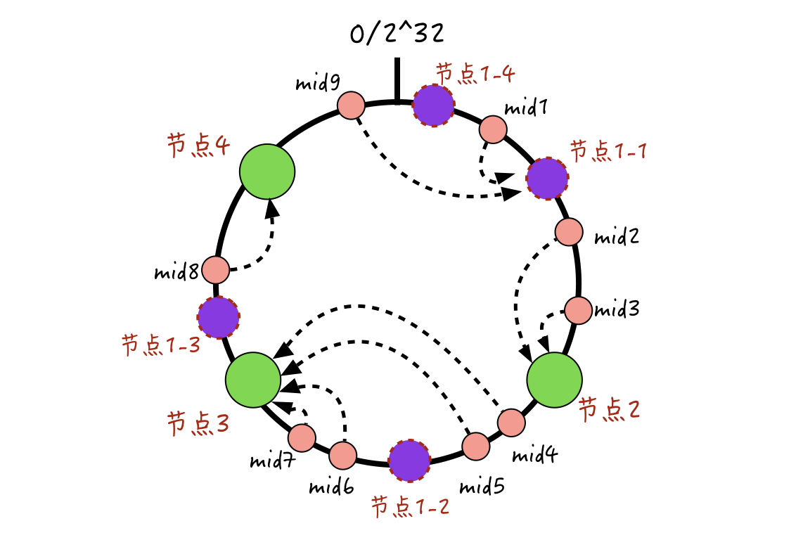 我们为每一个物理节点分配多个虚拟节点,比如在上图这里,给节点1虚拟出4个节点。当消息进行缓存哈希定位时,如果落到了这个物理节点上的任意一个虚拟节点,那么就表示,真正的缓存存储位置在这个物理节点上,然后服务端就可以从这个物理节点上进行数据的读写了。