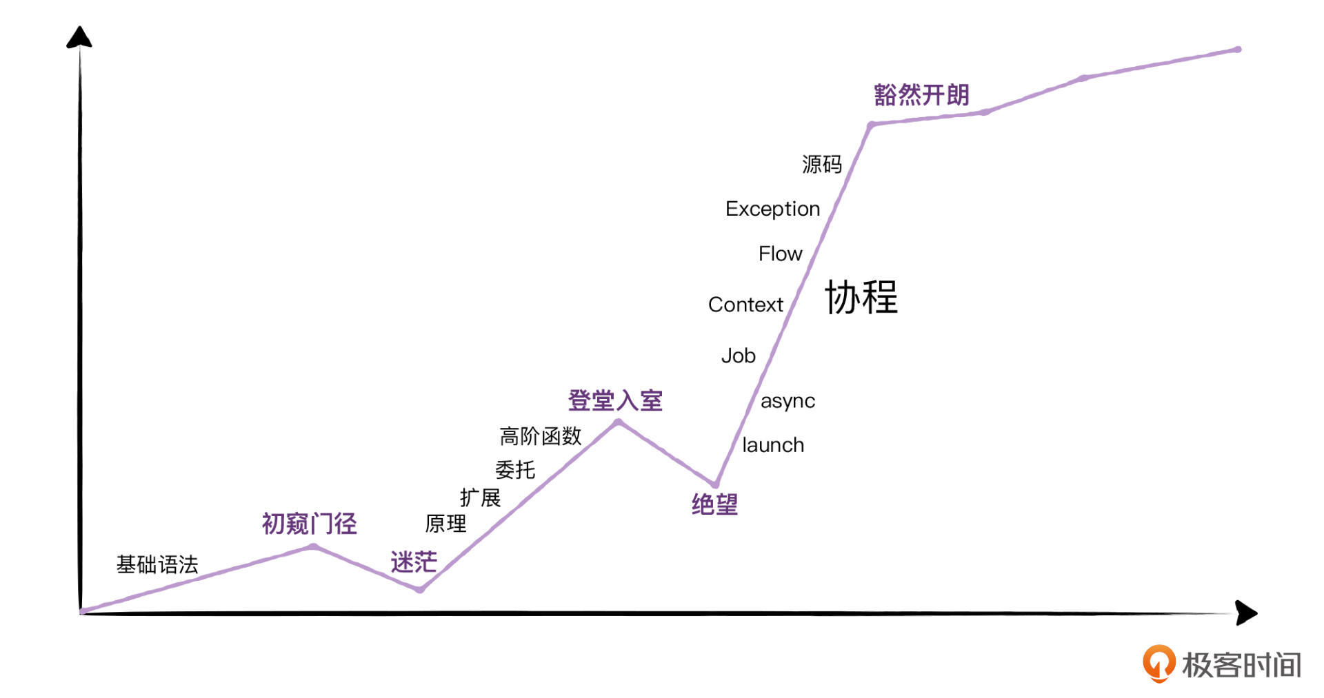 另外,**协程一直都是Kotlin学习的难点。**在过去这几年的研究中,我总结出了一套“协程思维模型”。在我写协程代码的时候,我的大脑里会有一套对应的模型,来帮我模拟协程的运行过程。而这些,我也会在这门课中,以最直观的方式传授给你。