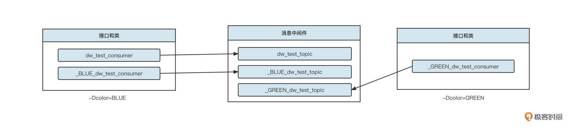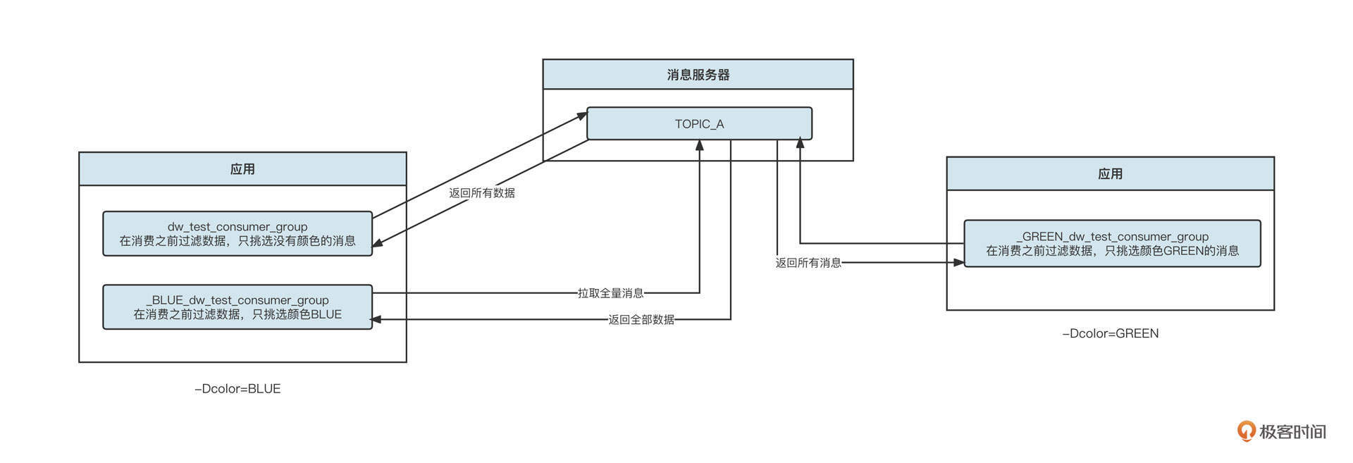 我们看应用3会部署在蓝、绿两个环境,但是在原始的镜头项目代码中我们只会定义一个基本的消费组,例如dw_test_consumer_group,蓝绿发布要求我们这套代码用不同的系统属性定义后,就能分别实现消息的过滤。