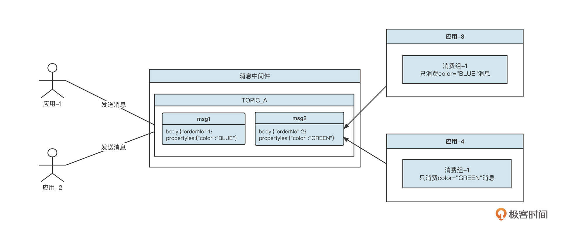 消息中间件中的另外一种隔离机制是基于消息属性的。例如,蓝绿两种颜色的消息使用的是同一个主题,但我们可以在消息中添加一个属性,标识这条消息的颜色。其存储示意图如下: