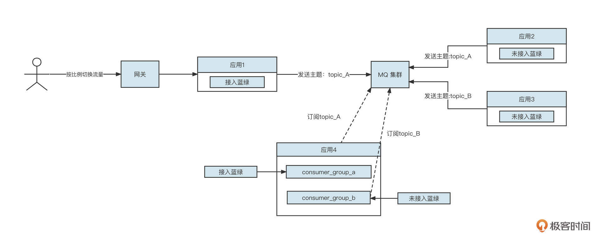 - 应用2不支持蓝绿发布,但同样需要在处理完业务后,向消息中间件中的topic_A发送消息。
