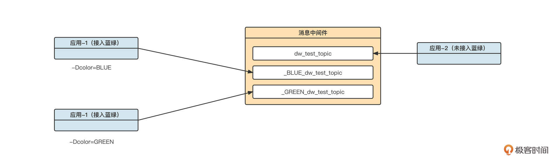 - 应用3不支持蓝绿发布,需要处理完业务逻辑后,向消息中间件中的主题topic-B发送消息。