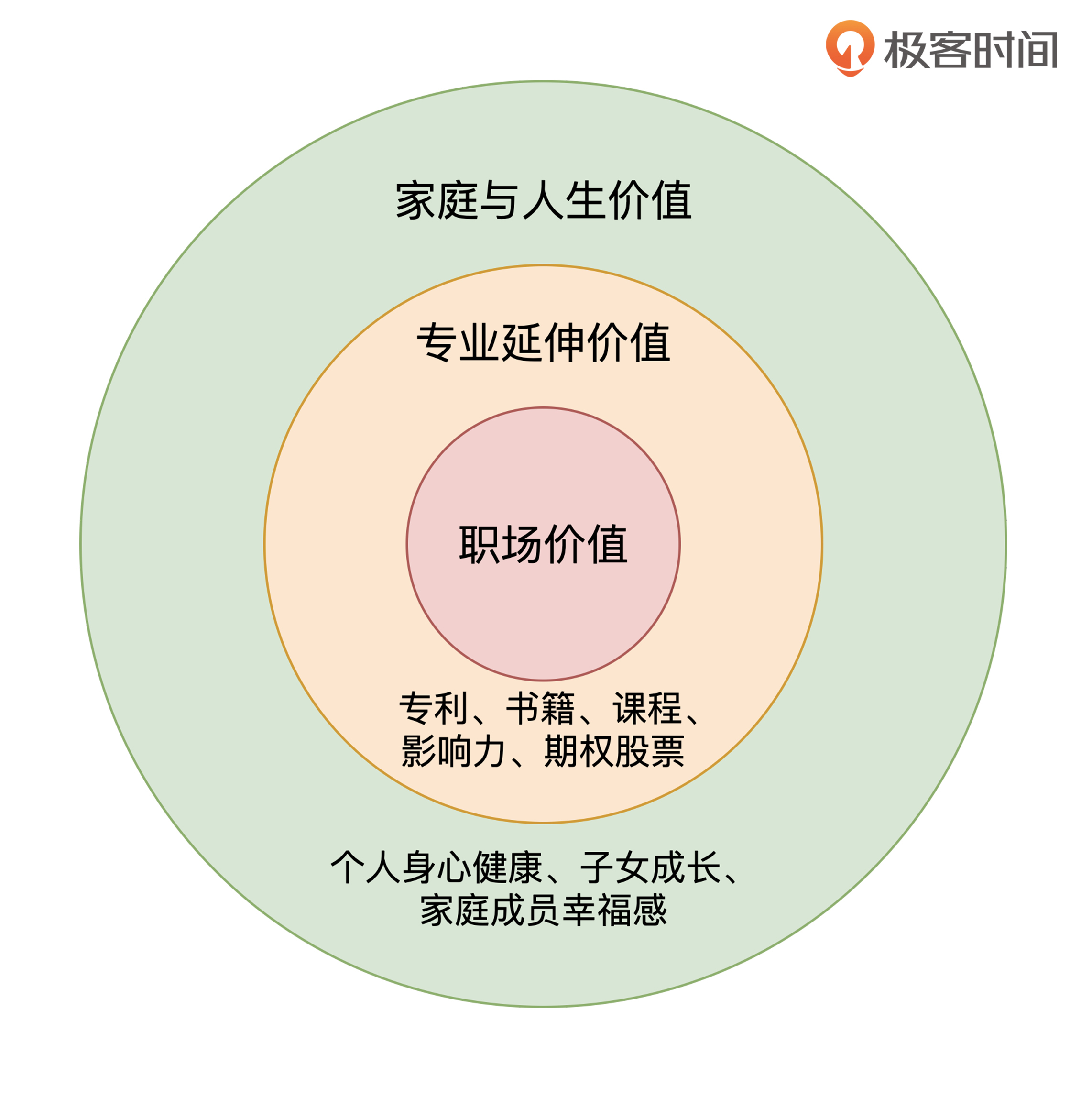 - 个人价值由三个同心圆组成,它们由内而外依次是“职场价值”“专业延伸价值”和“家庭与人生价值”。