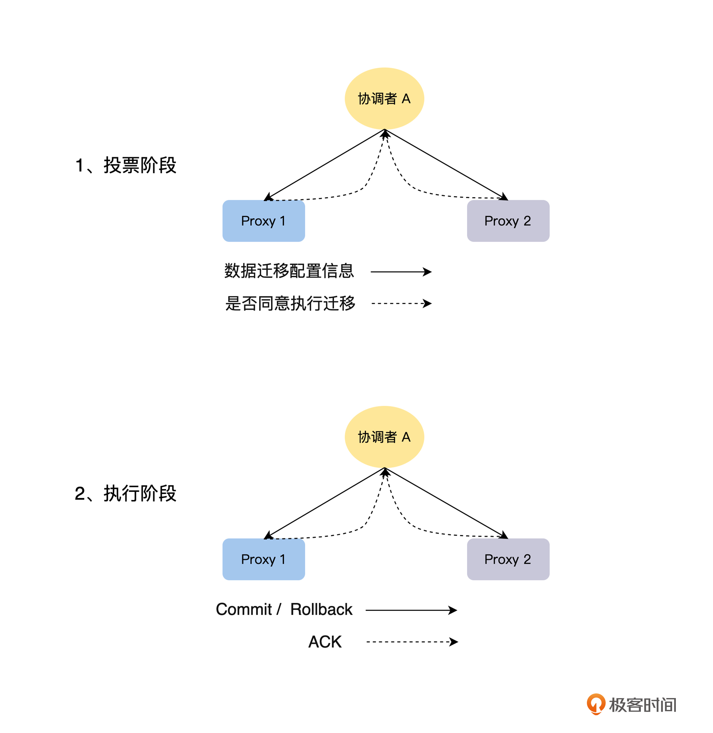 在执行阶段,协调者 A 收集所有的 Proxy 节点的反馈,如果所有的 Proxy 都同意执行数据迁移,那么协调者 A 向所有的 Proxy 节点发送 Commit 消息,Proxy 节点收到 Commit 消息后,就应用数据迁移的配置信息,按最新的配置信息,接受读写请求,进行数据迁移。上文的例子,就是对于数据集 2 的读写请求,都路由到节点 2 来处理,否则就发送 Rollback 消息,Proxy 节点收到后,回滚状态,重新接受读写请求。