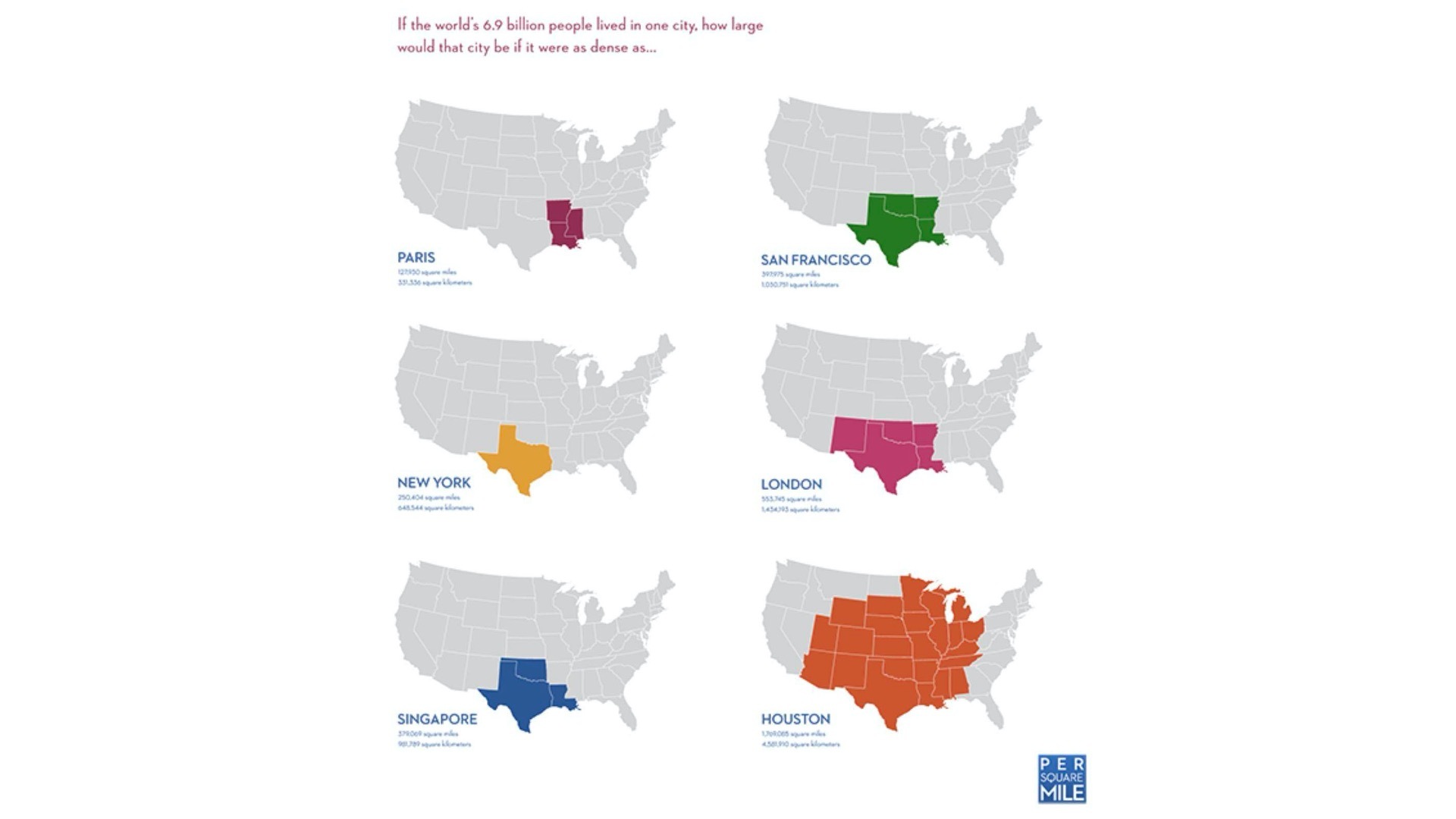 其实具体怎么做,并没有定论,我们只能通过例子慢慢积累经验,随着经验的丰富,你就能慢慢找到设计合适的可视化方式的感觉。比如说,现在你就可以想想,我在下面给出的这个例子。例子中给出的数据图表是Tim De Chant的世界人口地图。其中一共有6个城市,每个城市的人口密度不同,如果我们要把全球70亿人都放在任意密度的城市中,这个城市会有多大呢?
