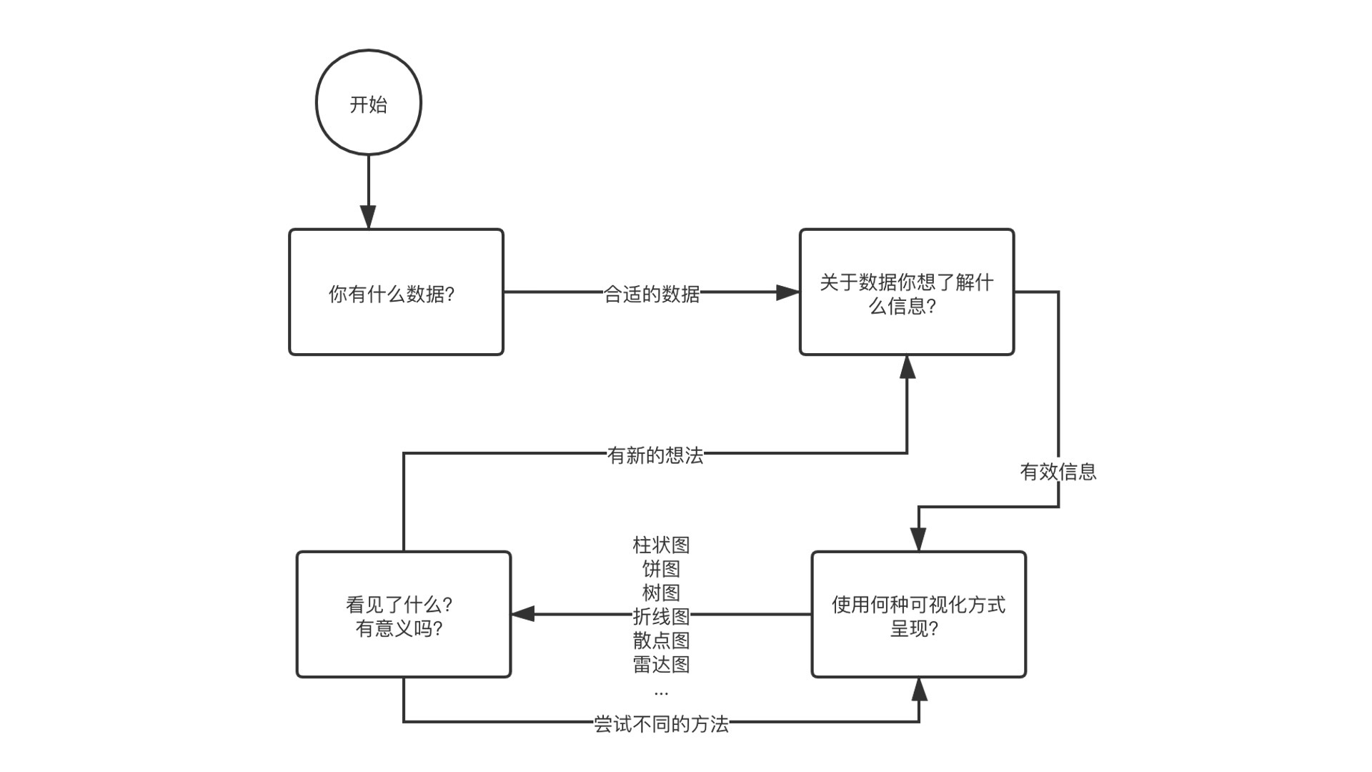 所以在数据可视化中,你有什么样的数据其实是最重要的,而我们的可视化手段会随着具体数据集的不同而不同。因此,我们一般会围绕4个问题对可视化过程进行迭代,它们分别是你有什么数据?你想从数据中了解什么信息?你想用什么样的可视化方式呈现?以及你看到了什么,它有意义吗?并且,前一个问题的答案都会影响后一个问题的答案。