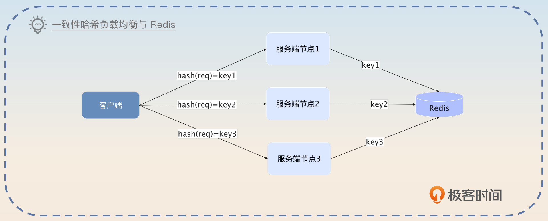 这个方案主要解决的是并发更新的问题,因为它通过哈希负载均衡算法做到某一个 key 只有一个服务端节点在处理。因此你将本地缓存换成 Redis 也一样可以。