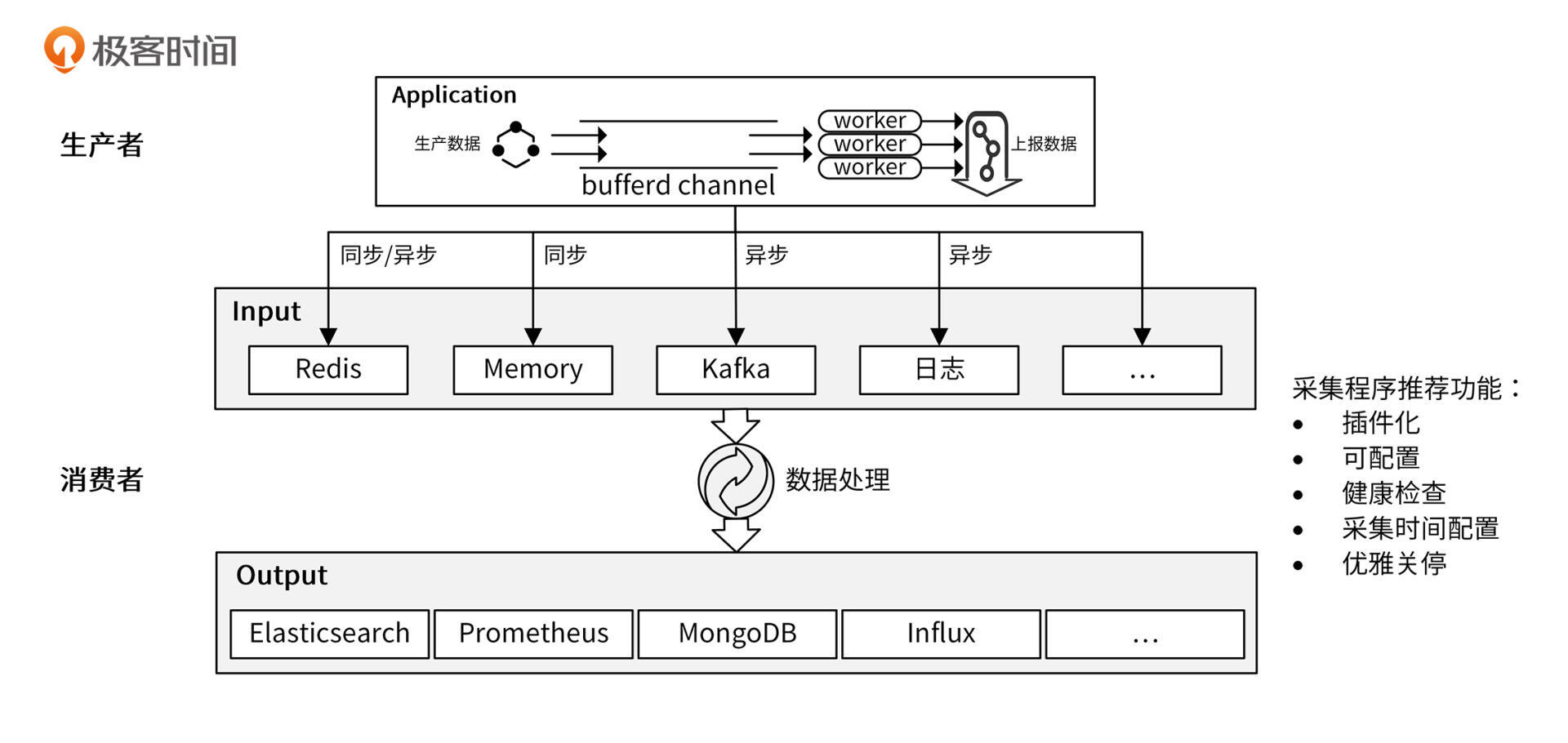 现代应用程序越来越讲究插件化、扩展性,在设计采集系统时,也应该考虑到未来的需求。比如,未来你可能需要将数据从上报到 MongoDB 切换到 HBase 中,或者同时将数据上报到 MongoDB 和 HBase 中。因此,上报给下游的程序逻辑要具有插件化的能力,并能通过配置选择需要的插件。