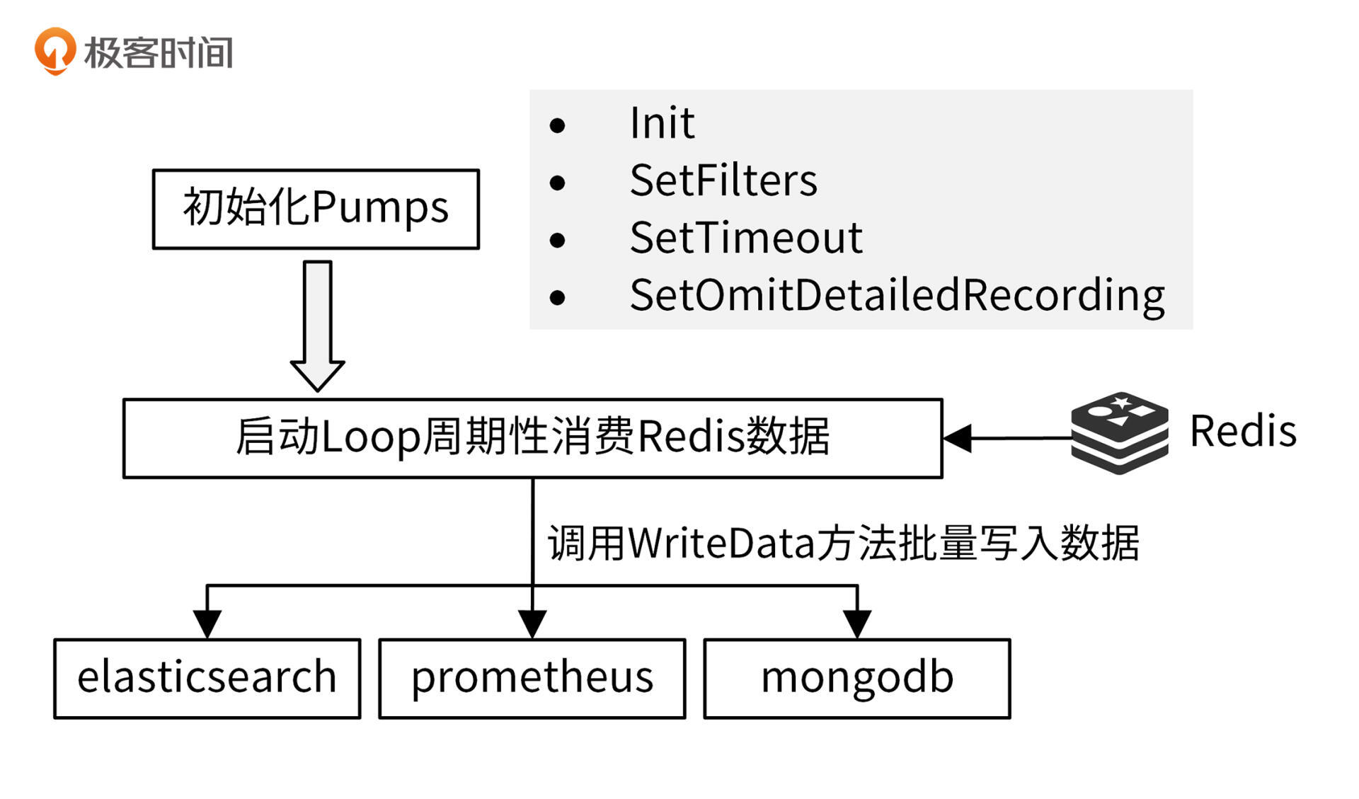 iam-pump 的设计要点是:插件化、可配置地将 Redis 中的数据处理后存储到下游系统中,并且实现优雅关停功能,这些也是设计数据采集程序的要点和难点所在。下面,我们就来看下 iam-pump 是如何插件化地实现一个数据采集程序的。这个数据采集程序的设计思路,在我开发的大型企业应用中有实际的落地验证,你可以放心使用。