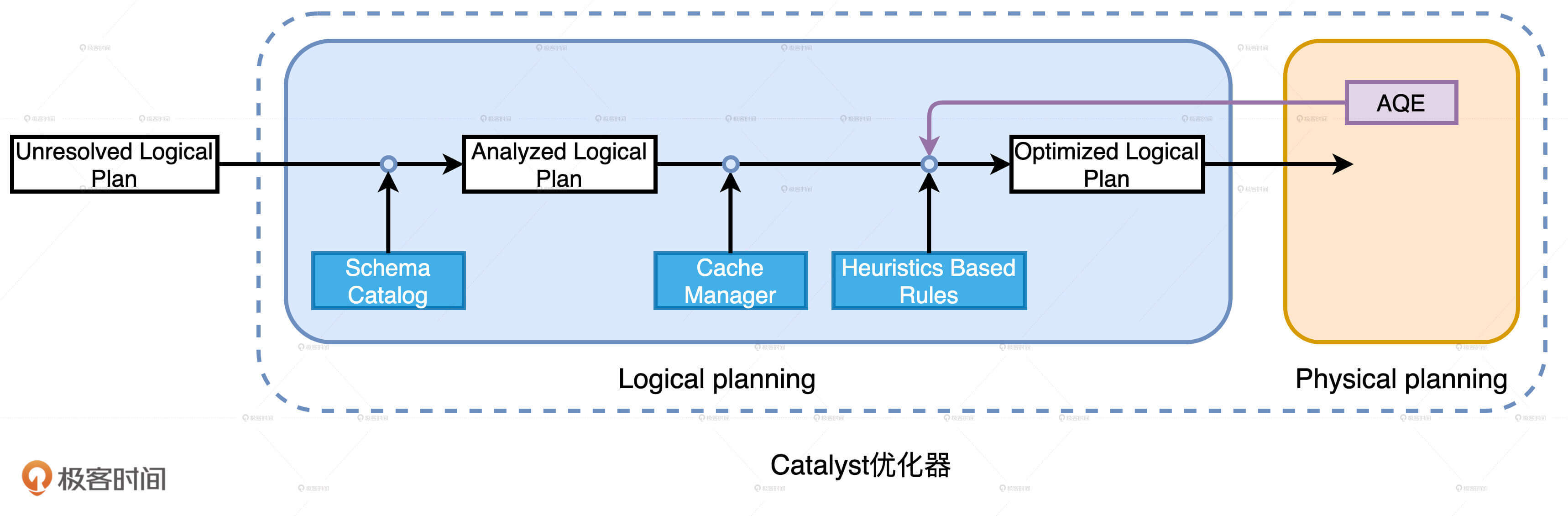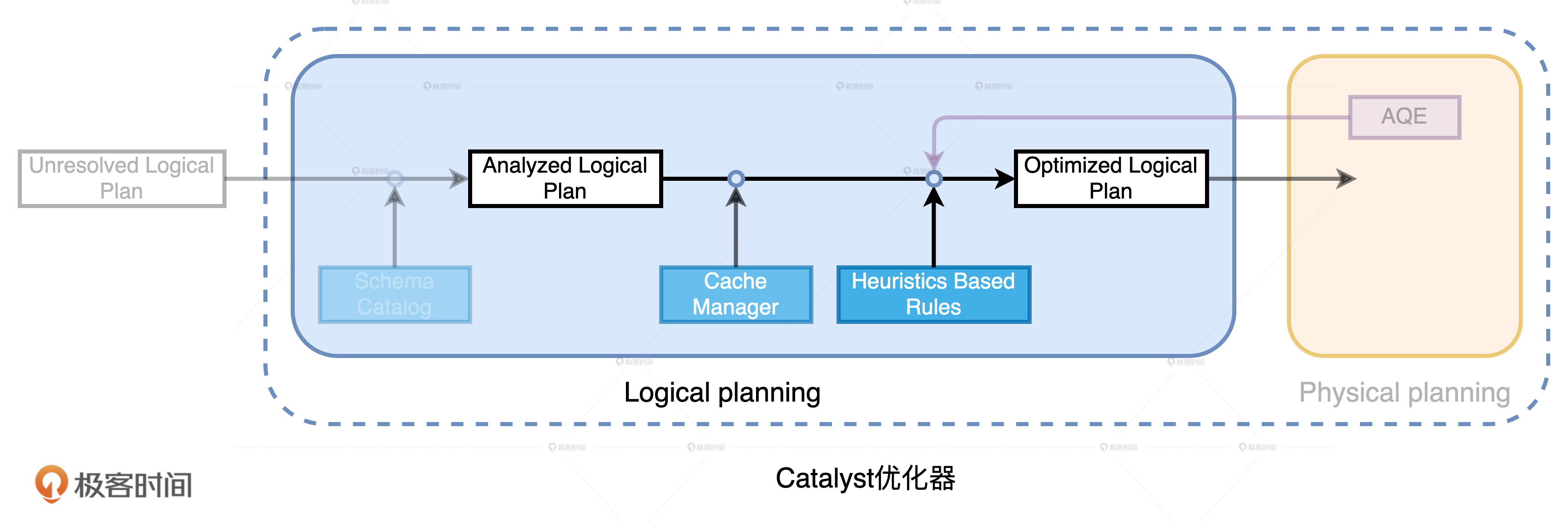 今天这一讲,我们主要探讨了Catalyst优化器的逻辑优化阶段。这个阶段包含两个环节:逻辑计划解析和逻辑计划优化。