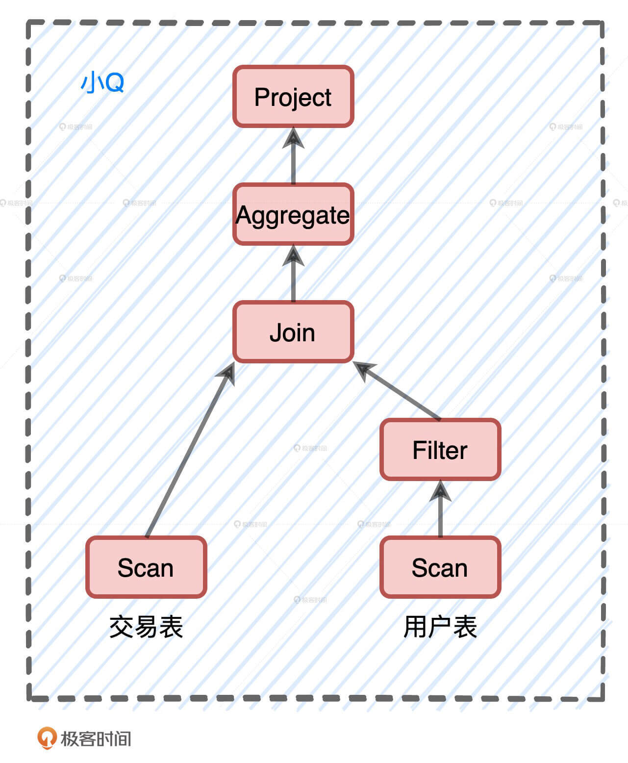 对于现在的小Q来说,如果我们不做任何优化,直接把它转换为物理计划也可以。但是,这种照搬开发者的计算步骤去制定物理计划的方式,它的执行效率往往不是最优的。